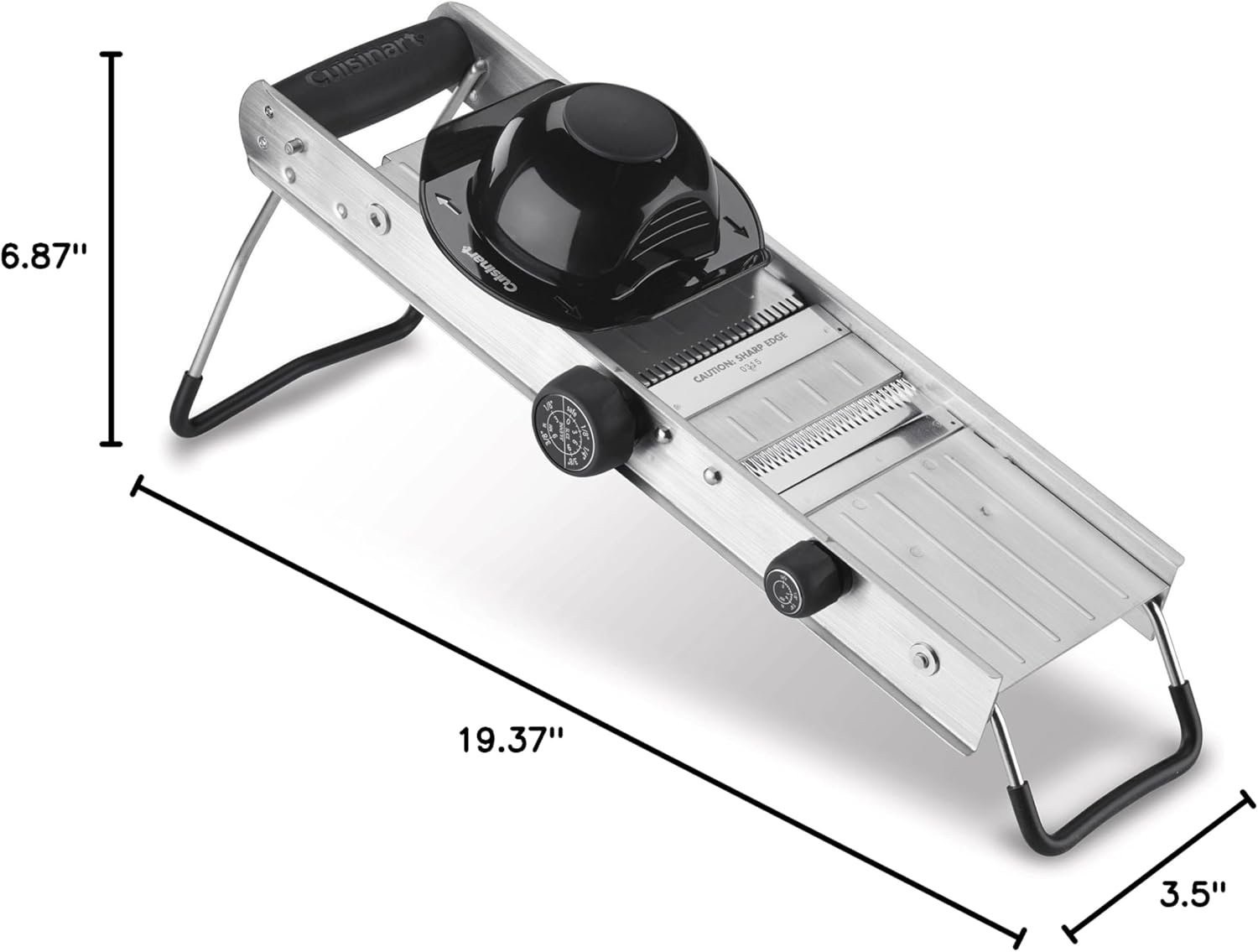 The Stainless Steel mandoline has 4 cutting options featuring Cuisinart exclusive food Processor blade technology. Includes cut resistant safety glove. Features: Superior stainless steel blades|4 cutting options featuring Cuisinart’s exclusive food processor blade technology|Precise thickness adjuster|Built-in blades|Cut-resistant glove included
