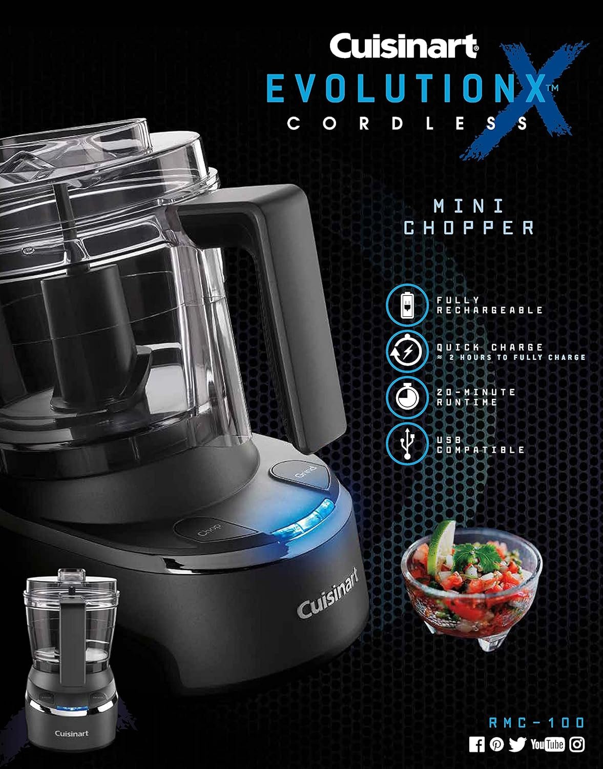 Introducing the cord-free compact chopper that maximizes powerful performance and portable convenience. Equipped with a 4-cup capacity work bowl and precision stainless steel blade, this mini yet mighty kitchen essential makes quick work of any chopping task. 7.4 volts of lithium ion power—easily recharged with a USB cord—provide peak efficiency.