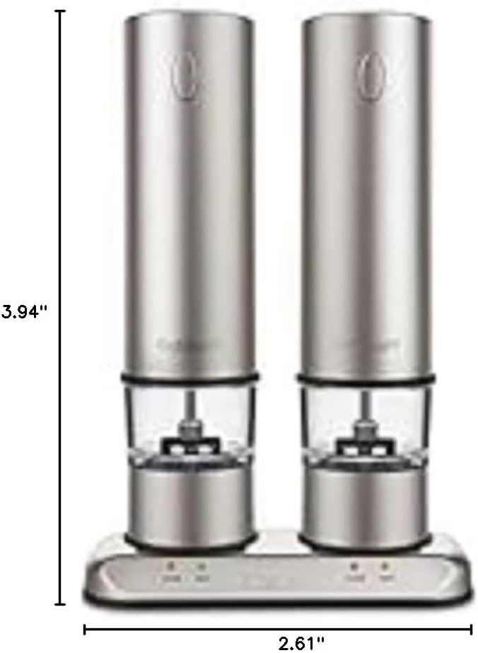 Add elegance and convenience to your kitchen. Cuisinart Rechargeable Salt & Pepper Mills make it easy to serve freshly ground salt and pepper. Mills sit in a stainless steel power base with charge and ready indicator lights and are always fully charged for 15~20 minutes of continuous use. LED base lighting helps you get the amount of seasoning you want, where you want it! Mills adjust settings from fine to coarse. Clear spice holder containers make it easy to check salt and pepper levels at a glance.
