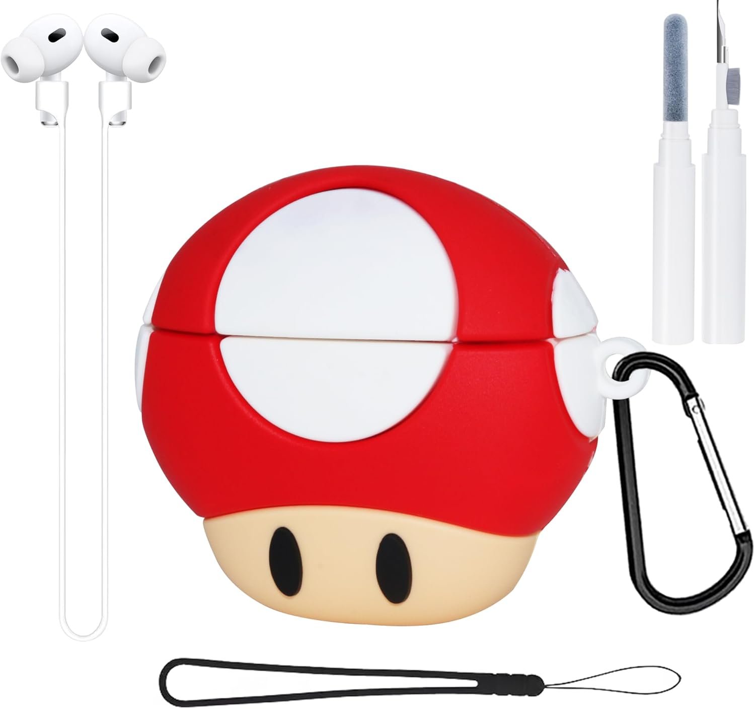 5 in 1 Accessories Set: 1 x cute airpod pro case Mushroom, 1 x keychain(Easily clip on your backpack and key-ring,you can put your airpod on your shoulder bag,belt and bakcpack when traveling, running, fitness and other outdoor sports), 1 x cleaning pen kit, 1 x black Wrist Strap, 1 x Anti-lost lanyard [Hooking around neck]