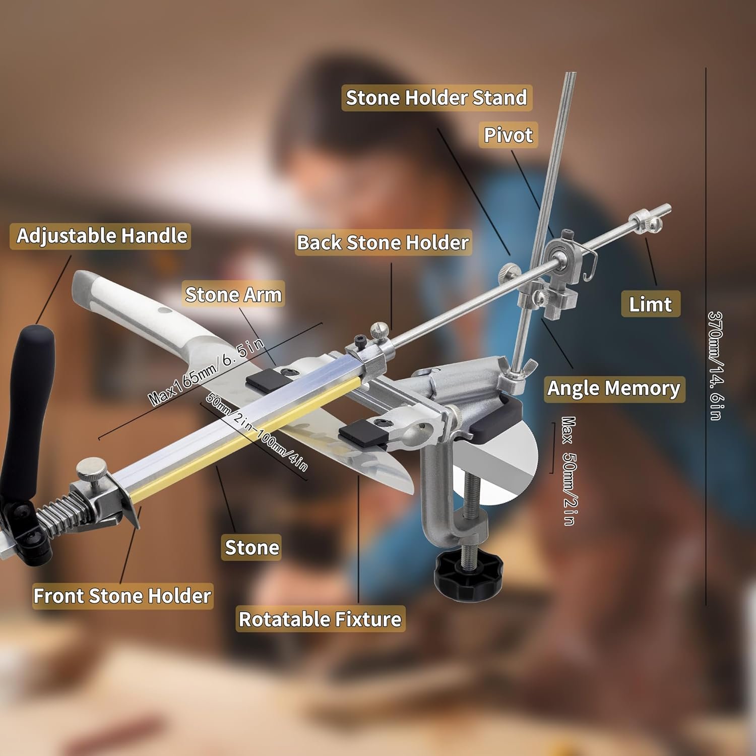 RX-009, A HUGE UPGRADE: 360° Flip Rotation Fixed-Angle Design with Precise Slider Hinge and Firm G-Clamp Fixture, this ensures easier and more secure knife sharpening, the innovative flip fixture system allows you to sharpen the other side at the same exact angle, adjust the angle by unscrew the screw on the vertical rod, restore knives and tools quickly and safely;
