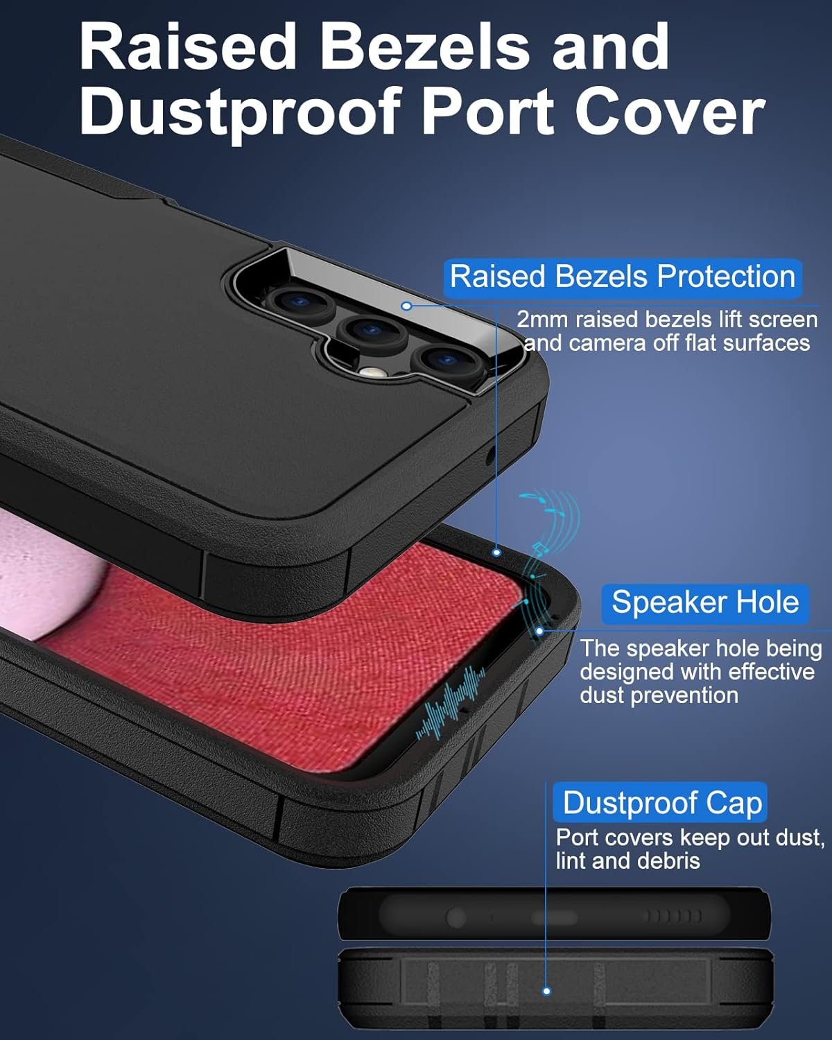 Full Body Covered & Dustproof Cap – Combined with plastic inner cover and rubberized outer shell, this galaxy a14 5g phone case offers military grade drop protection; 2mm raised lips to protect screen and camera from scratching; Port covers keep out dust, lint and debris