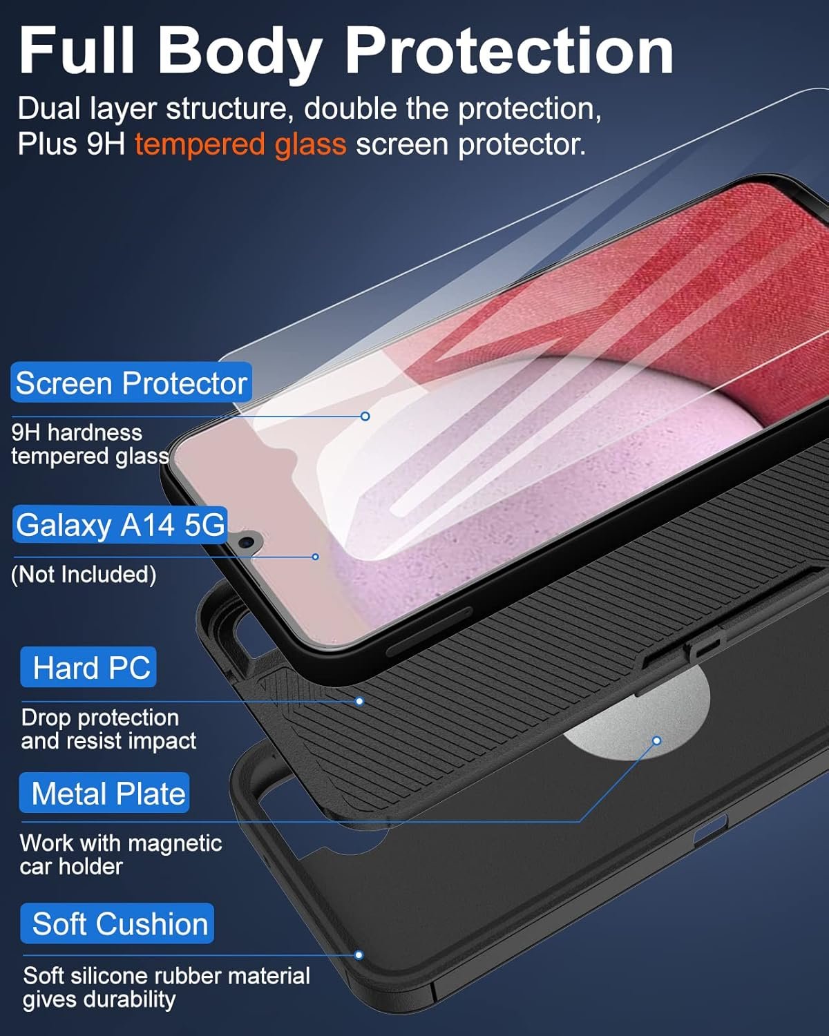 Galaxy A14 5G Case and Glass Screen Protector – Specially designed phone case for Samsung Galaxy A14 5G 6.6-Inch; Packed with 1pcs tempered glass screen protector; Offers 360 degree full body protection but slim profile; Work with magnetic car mount