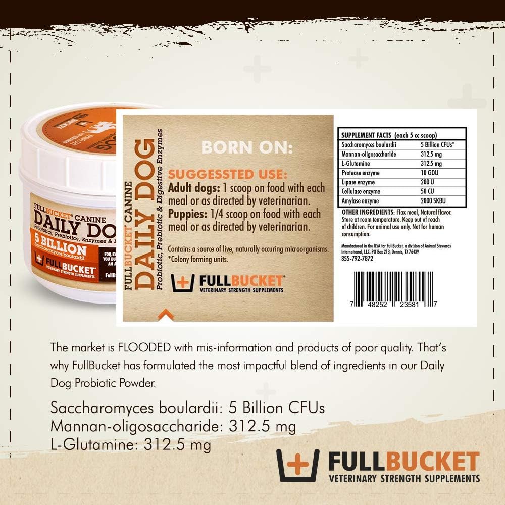 We’ve added prebiotics to our probiotic powder for dogs. These prebiotics, called mannan-oligosaccharides, are derived from yeast and help feed the good germs, assisting them as they grow and populate the gut. They also help prevent infectious germs from attaching to the walls of the bowels, stopping them from taking hold and causing damage. This benefit is especially useful if your dog is experiencing an episode of loose stools or a parasite infection.