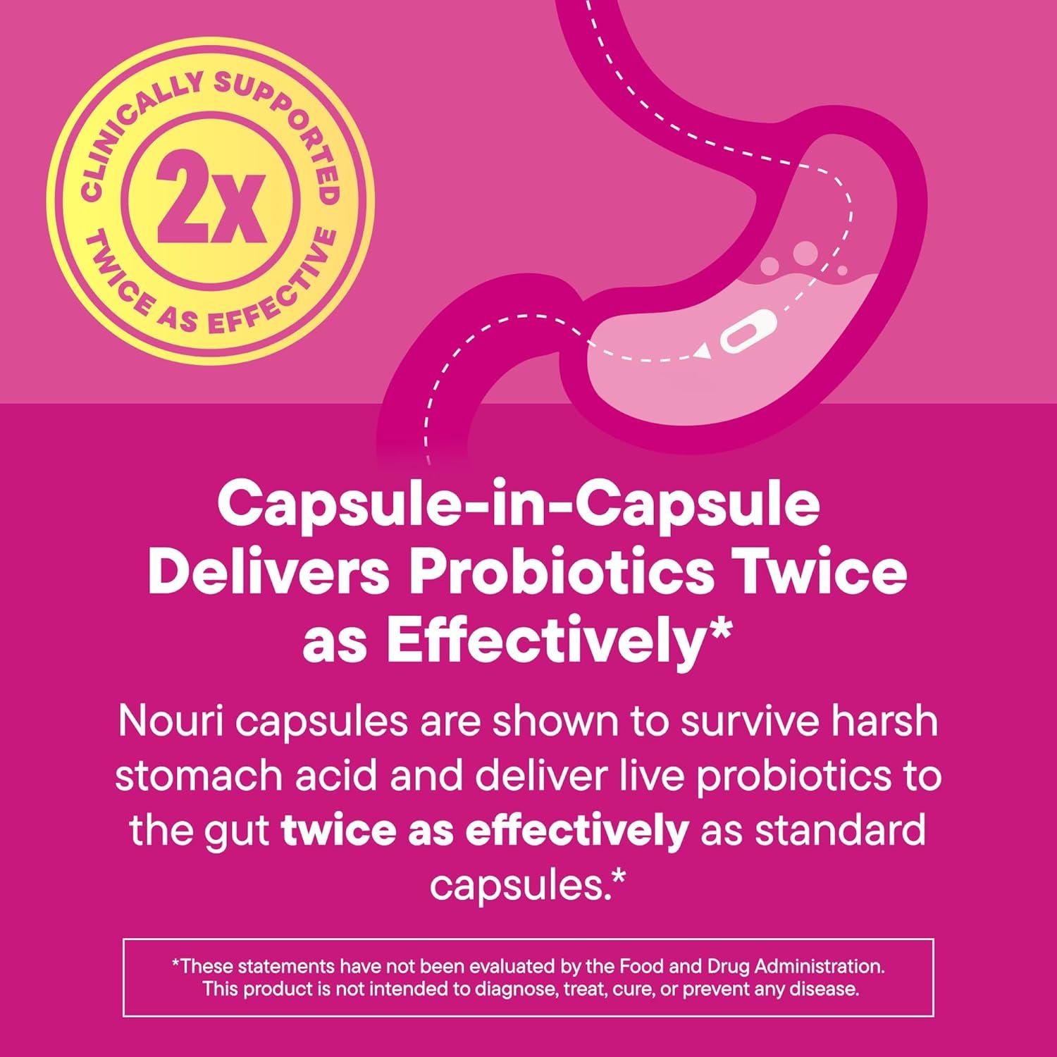 Superior Capsules – Nouri’s capsule-in-capsule technology survives stomach acid more effectively than standard capsules and delivers probiotics deeper into the gut.