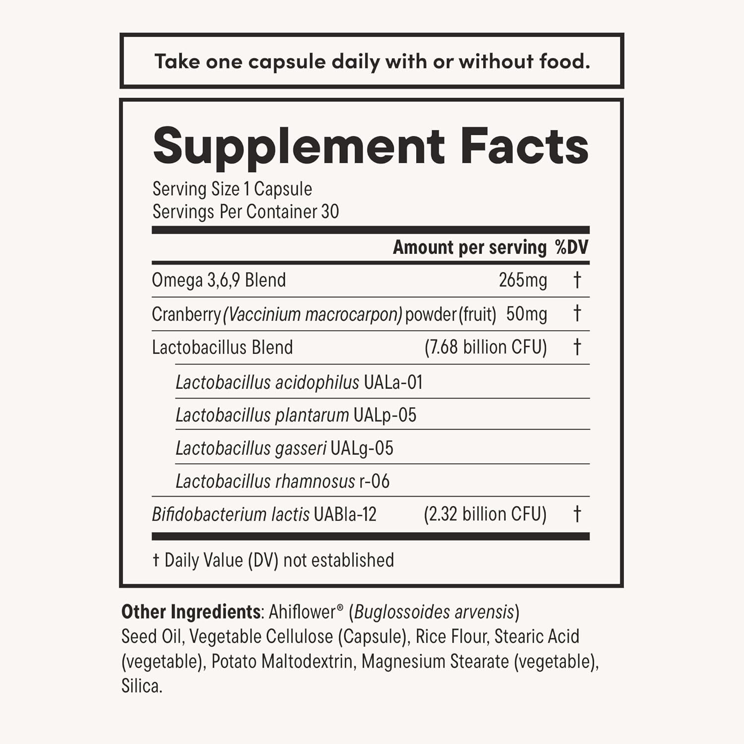 Women’s Probiotic – Each Women’s Health capsule contains a soothing blend of five probiotic strains to help support vaginal health and whole cranberry powder to help support urinary tract health.