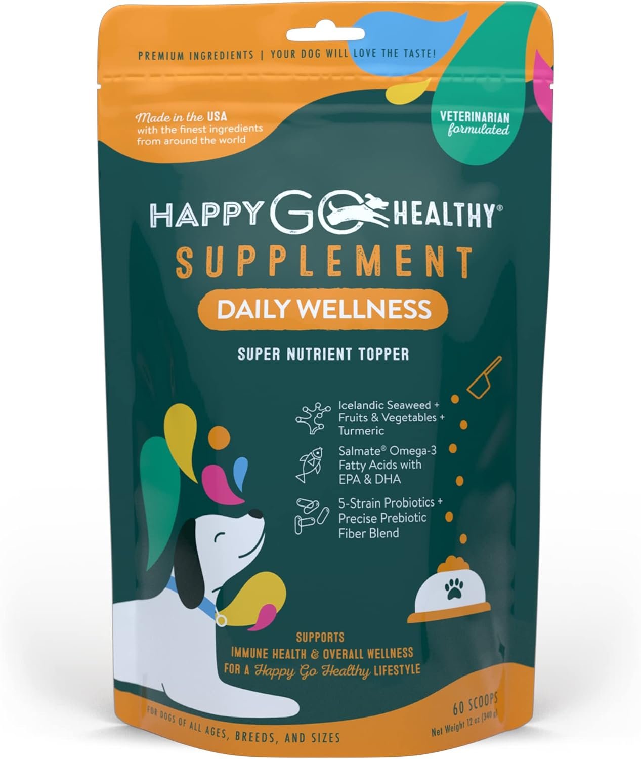 MADE IN USA: Our supplements are made in the USA with the world’s finest ingredients like SALMATE Wild Alaskan Salmon Oil alongside 1 Billion CFU/scoop of 5-strain probiotics plus prebiotic fiber to fortify your dog’s overall wellness all day, every day.