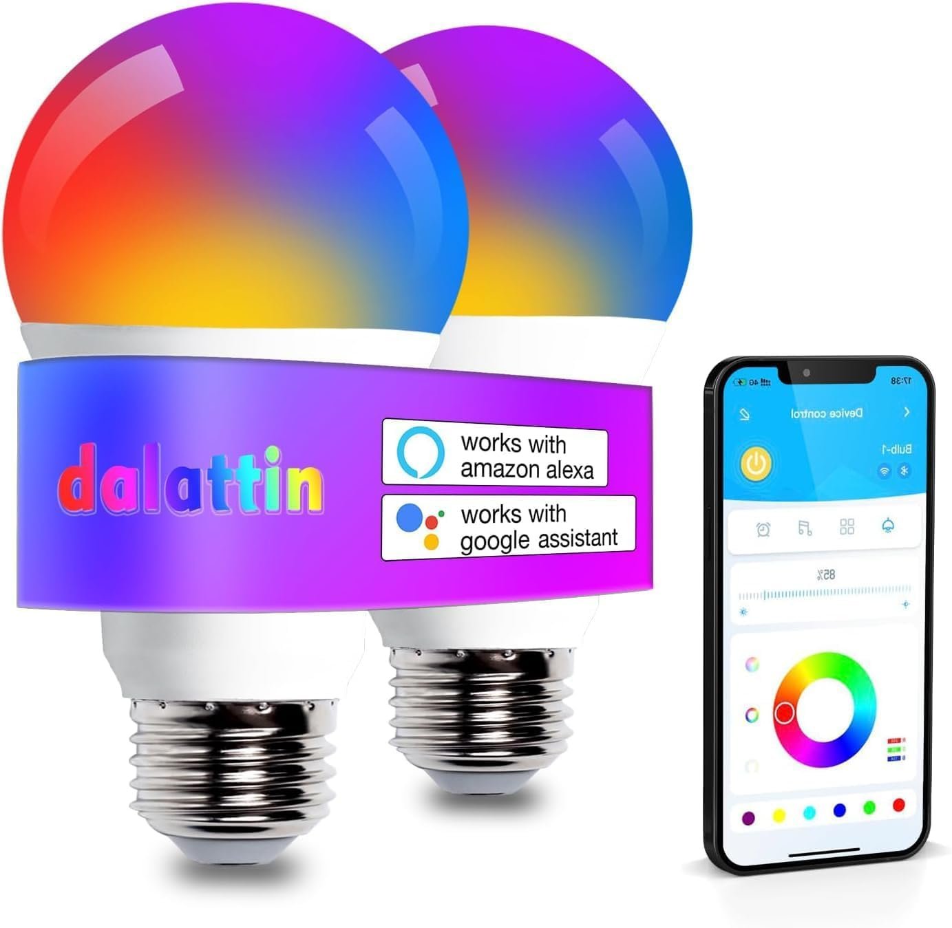 dalattin A19 Led Light Bulb, Smart Bulb Work with Alexa & Google Assistant, WiFi & Bluetooth App RGBCW Color Changing Light Bulb, E26 Led Bulb 60 Watt Equi, 800LM, Only Support 2.4GHz WiFi, 2 Pack