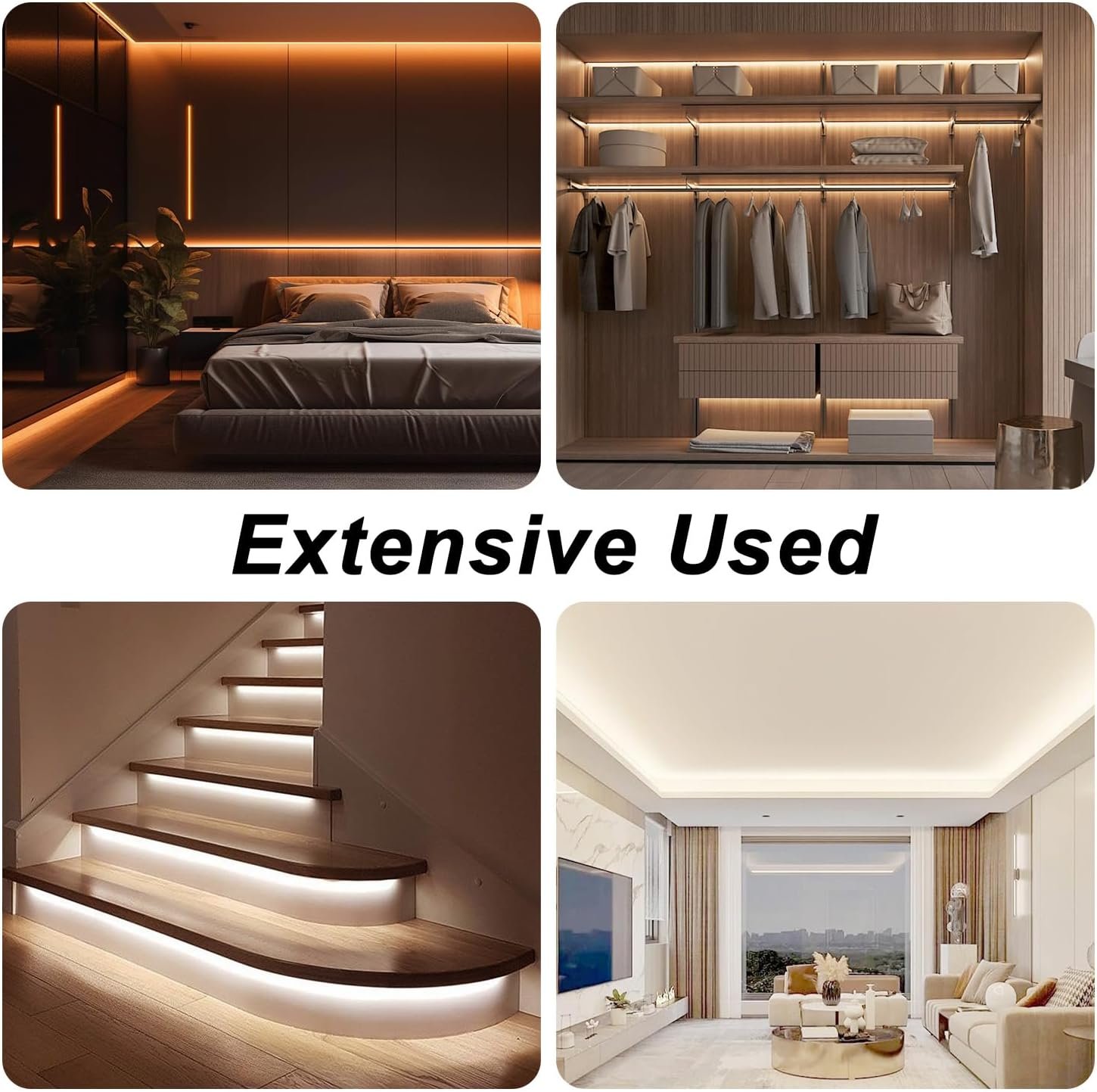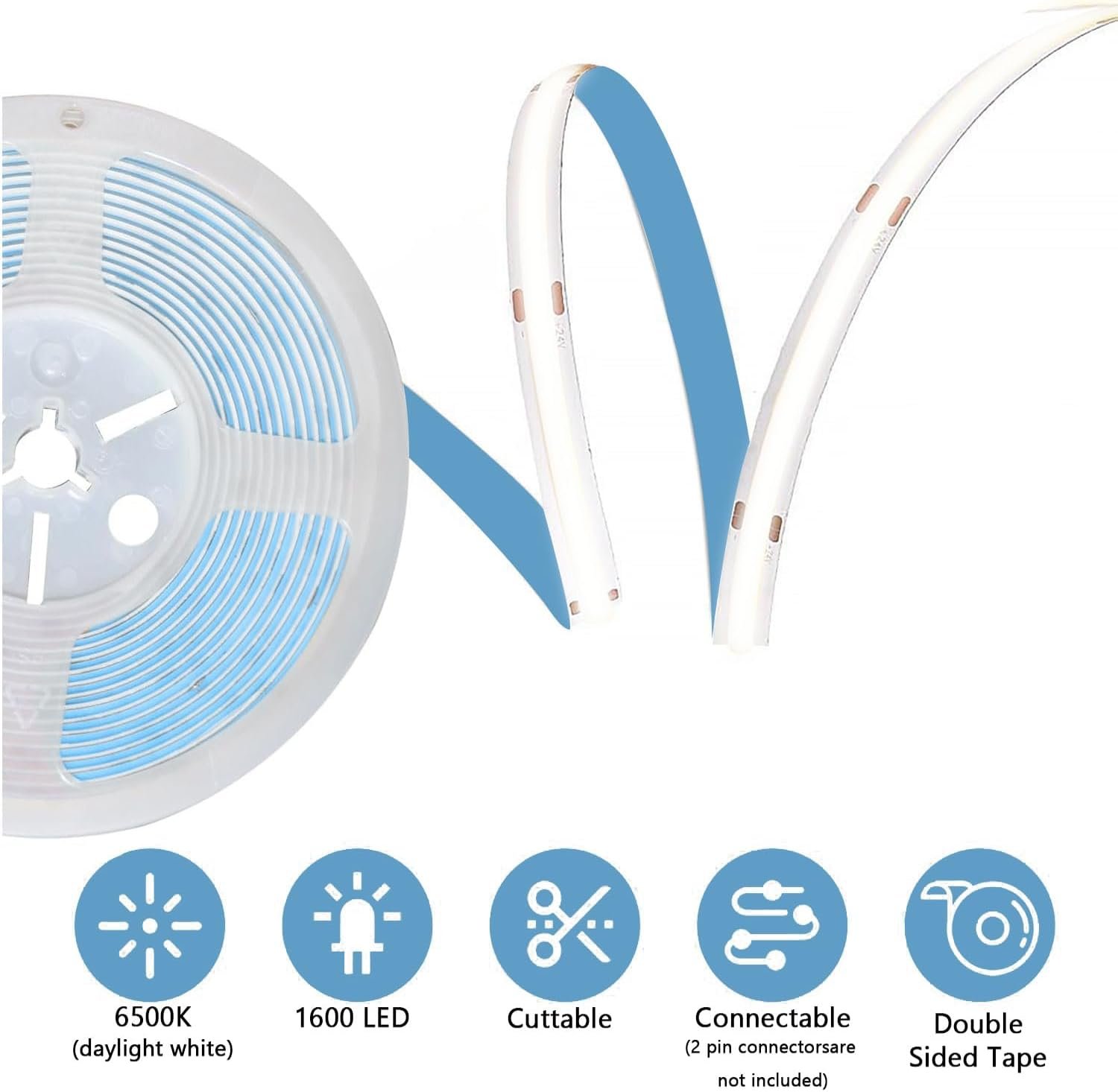 Versatile LED Lighting: The COB LED strip light offers a brilliant 6500 K white glow, perfect for enhancing the ambiance in various settings such as bedrooms, kitchens, living rooms, cabinets, countertops, and closets.