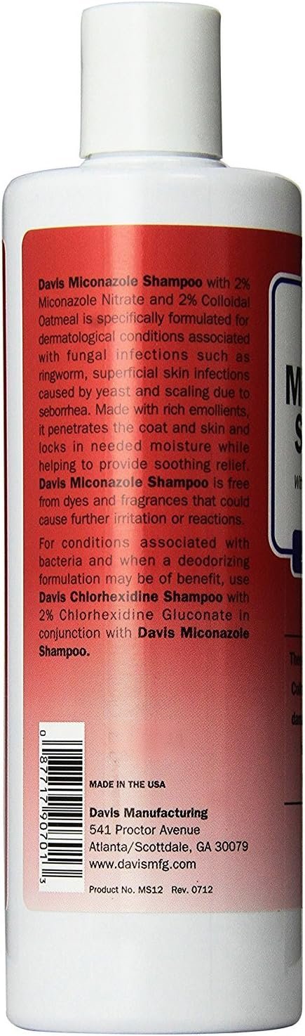 The rich miconazole shampoo helps relieve symptoms of fungal infections (including those associated with yeast and ringworm), while soothing damaged skin. Effectively aids in eliminating the scaling that is a by-product of seborrhea. 2 Percent colloidal oatmeal locks in needed moisture while providing soothing relief. Free from dyes and fragrances. Safe for dogs, cats, puppies and kittens. Ready to use. Ingredients are miconazole nitrate, colloidal oatmeal, sodium lauryl sulfate, propylene glycol, sodium laureth sulfate with ethanol, EGMS fatty acid esters, coconut based lathering agent, PEG distearate, lauramide D, aloe vera whole leaf, cosmetic grade preservative, purified water. Directions for use – Wet coat thoroughly with warm water. Apply shampoo to head and ears, then lather. Do not get shampoo into eyes. Repeat procedure with neck, chest, middle and hindquarter, finishing with legs. Allow shampoo to soak in for 10 minutes. To prevent ingestion, do not allow animal to lick while bathing. Rinse thoroughly with water. Repeat twice weekly until symptoms subside, then weekly, or as directed by a veterinarian. Available in 12-ounce size. Measures 7-1/2-inch length by 2-2/7-inch width by 2-2/7-inch height.