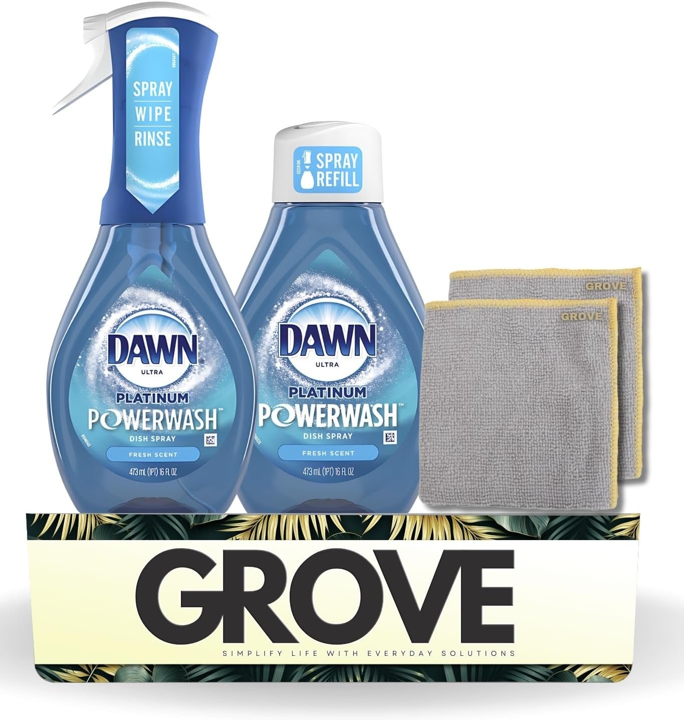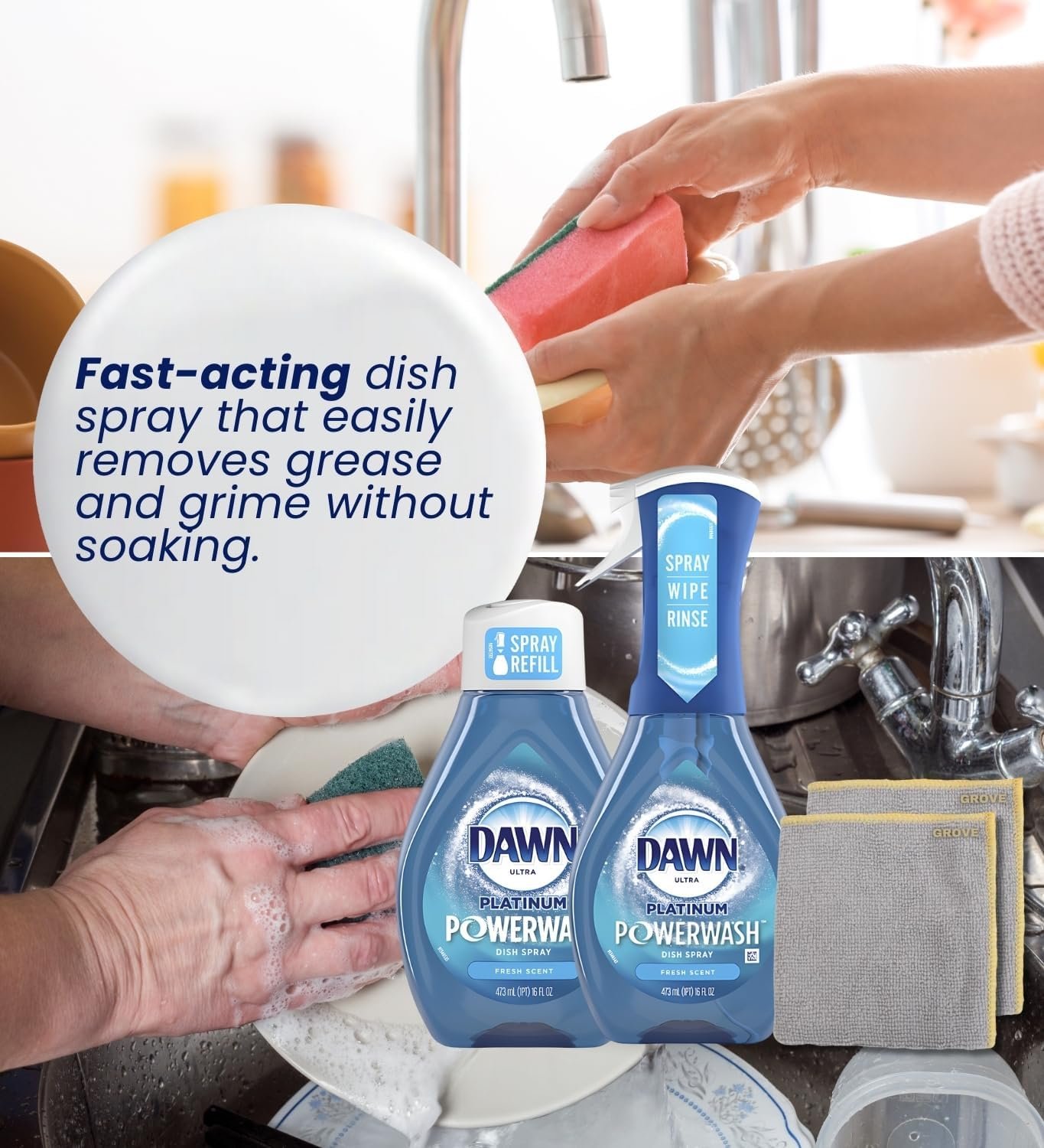 PERFECT BUNDLE SET – This set includes 1x Dawn Platinum Powerwash Fresh Scent Liquid Dish Spray and 1x Refill bundle with 2x Microfiber Cloths, ensuring a thorough clean and polished finish on dishes and kitchen surfaces. (Packaging May Vary)