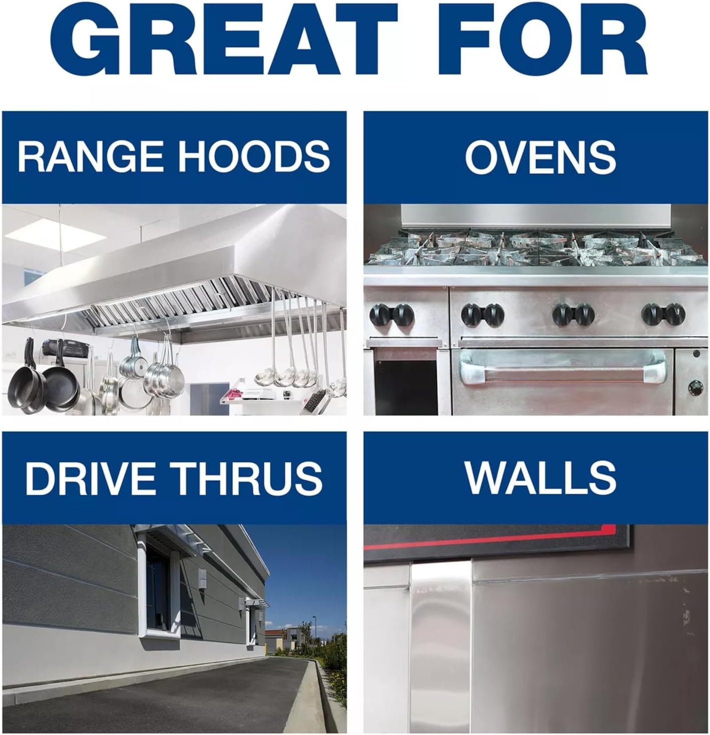 Great for tough buildup on surfaces, like greasy surfaces, stainless steel, range hoods, ovens, walls, drive-thru pads and parking lots