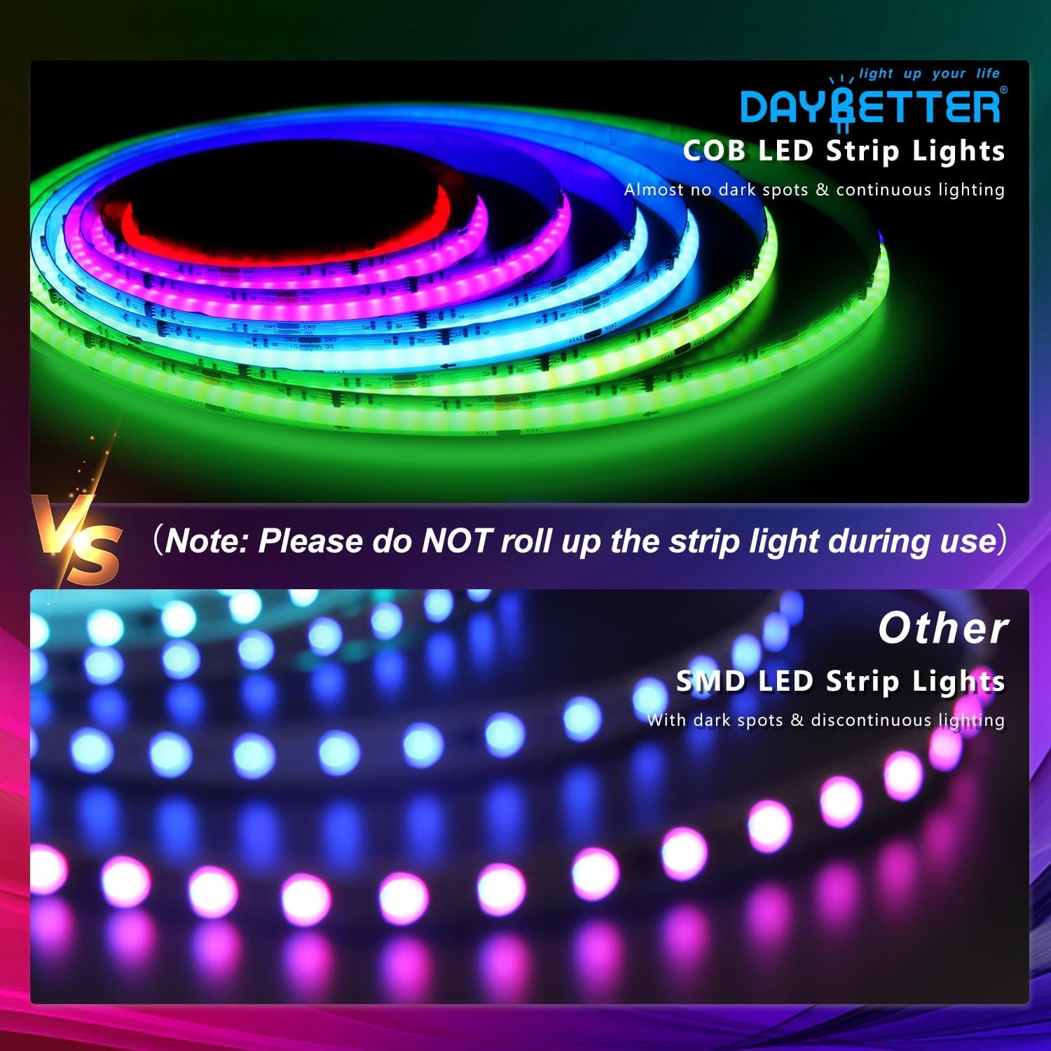 NO More Worries About Dark Spot: Unlike SMD LED strip lights with dark spots & discontinuous lighting, DAYBETTER 32.8ft COB Lights built-in 5760 LED beads(576 LEDs/3.28ft) can can delivers more brightness and continuous linear light. Create brighter, softer, spotless, and more uniform light area. Also COB lights lighting area is more spacious than SMD lights, because COB LEDs beam angle is 180-degree but SMD LEDs beam angle only 120-degree