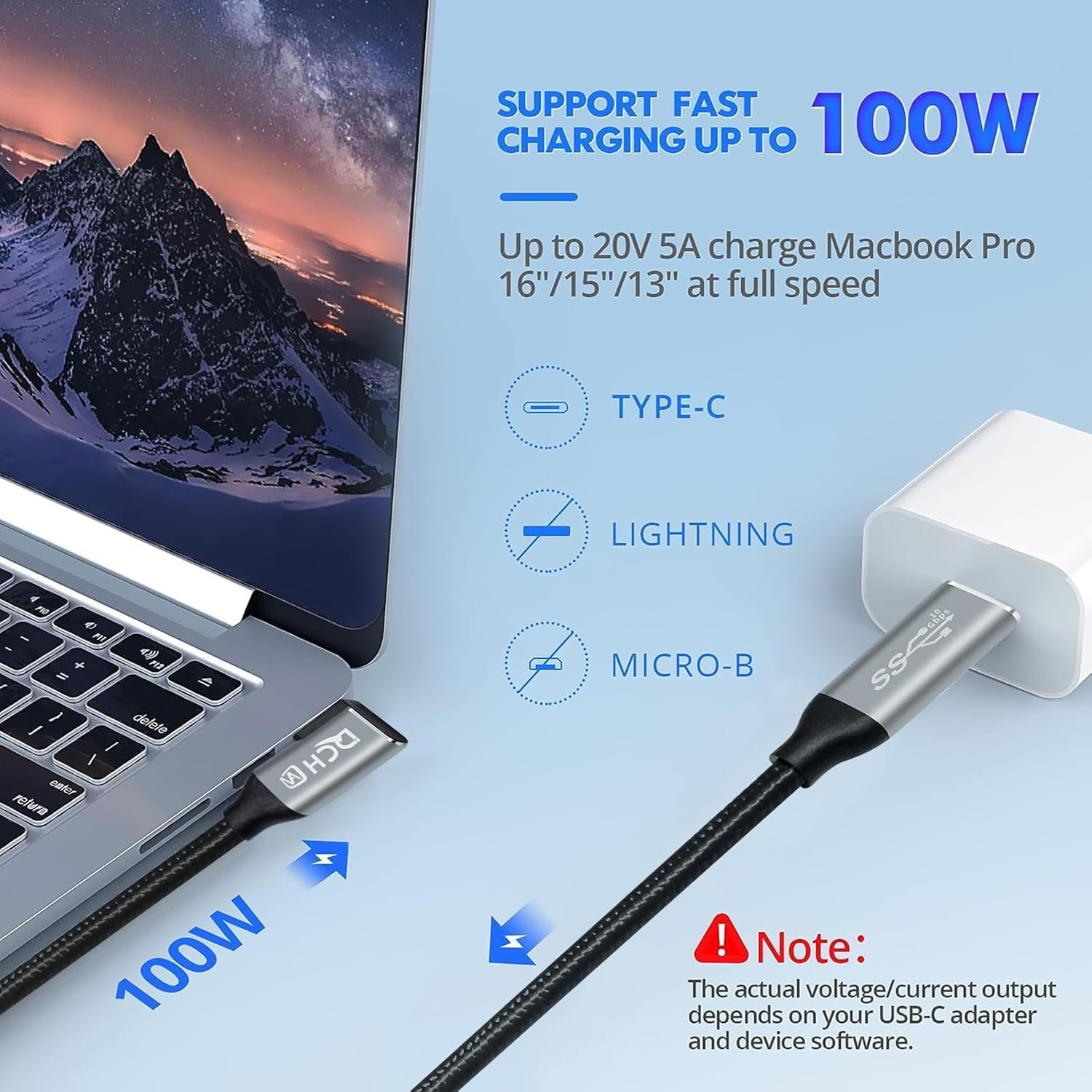 100W USB-C Charging Cable: Time Saver Well built with high quality E-marker smart chip, slim 5A USB C Charging Cable supports 100W PD quick charge (PD3.1, 20V 5A) to super fast fuel your Type-C port laptop or smartphone, also supports 65W, 60w, 50w, etc.