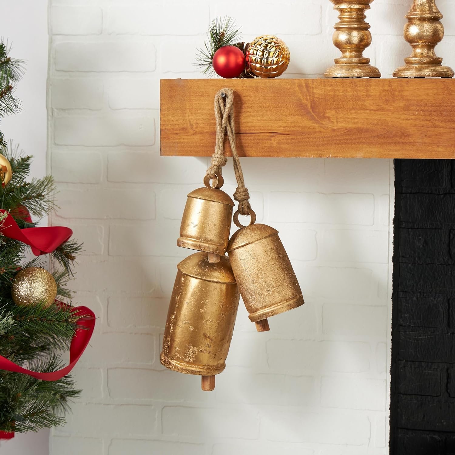 GOLD DECORATIVE BELLS FOR HOLIDAYS: Cylindrical bells hanging on a rope set is designed with a satin gold finish and a brown jute rope for a rustic appeal