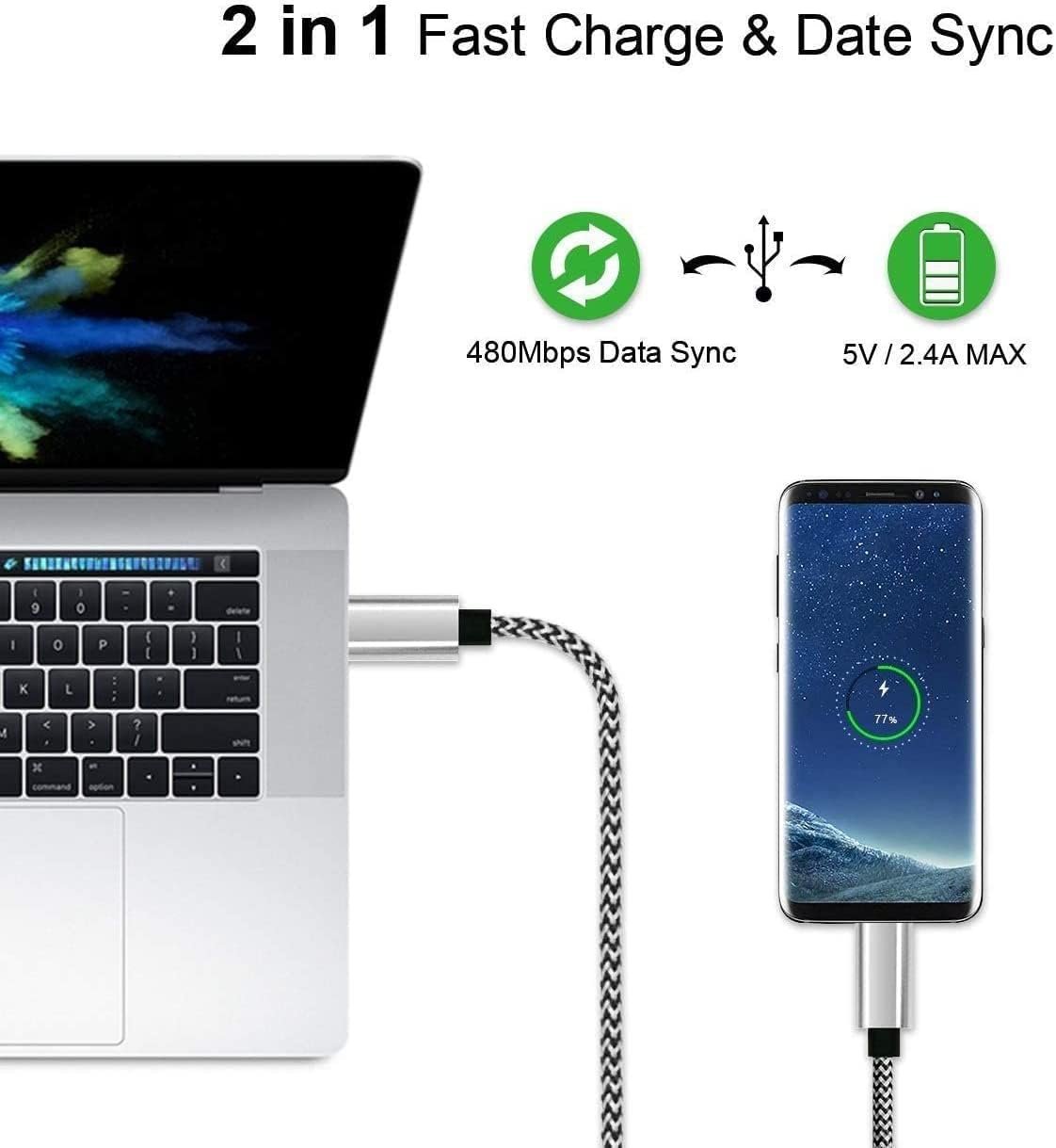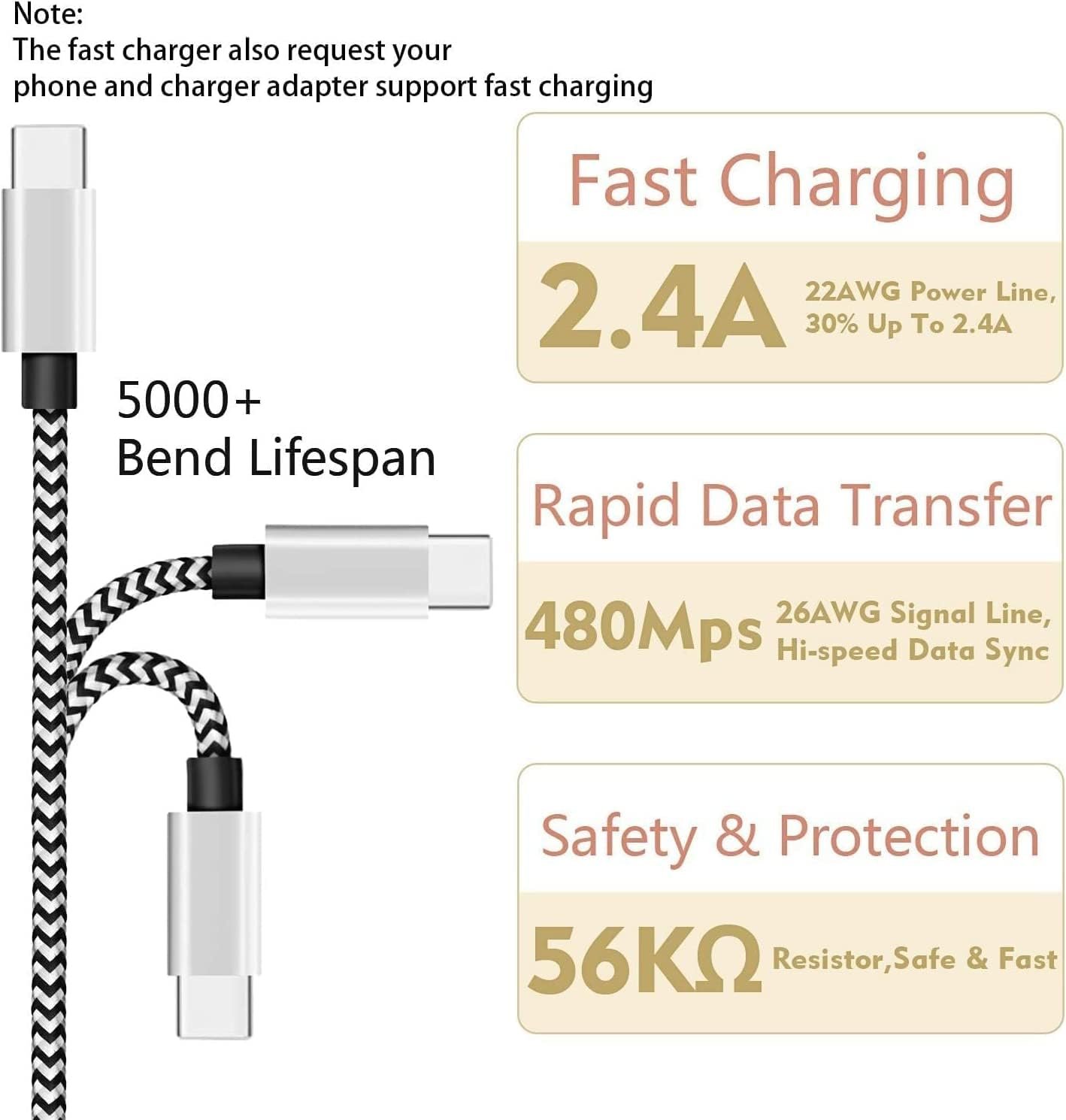 High Quality Nylon Braided: The cable has a high quality nylon braided design , sturdy nylon fiber cover adds premium durability to the cable, which makes it easily survive everyday usage and gives it a more stylish and elegant appearance that goes great with your expensive gadgets. The adherence to USB-C specifications ensures 2. 4A~3. 0A safe charging (Pull-up resistor – 56k) and safety of your gadgets