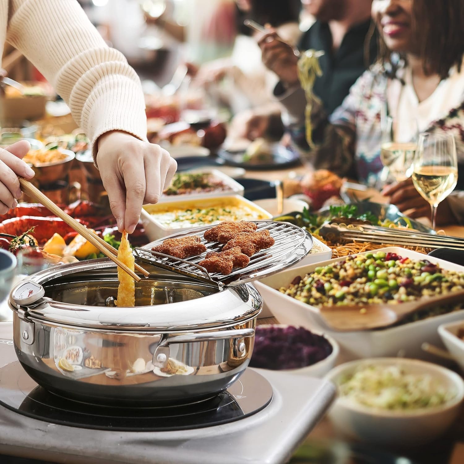 OIL TEMPERATURE CONTROL ; Thermometer with Fahrenheit (°F) is easy to read and helps you to make crispy frying food
