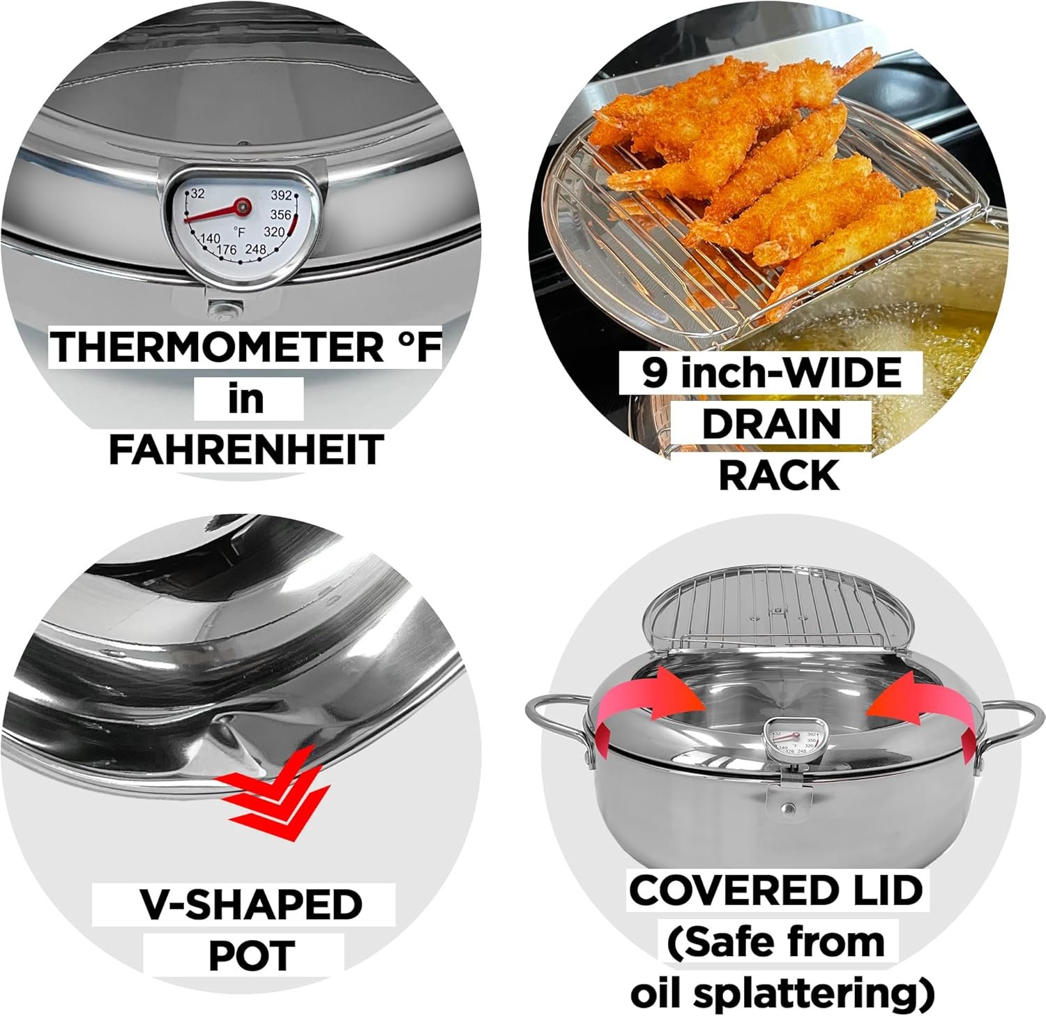PREMIUM QUALITY ; Made of durable 304 Stainless Steel, temperature control pot with insulated handle, domed lid, oil drain rack, and V-shaped mouth to pour oil easily