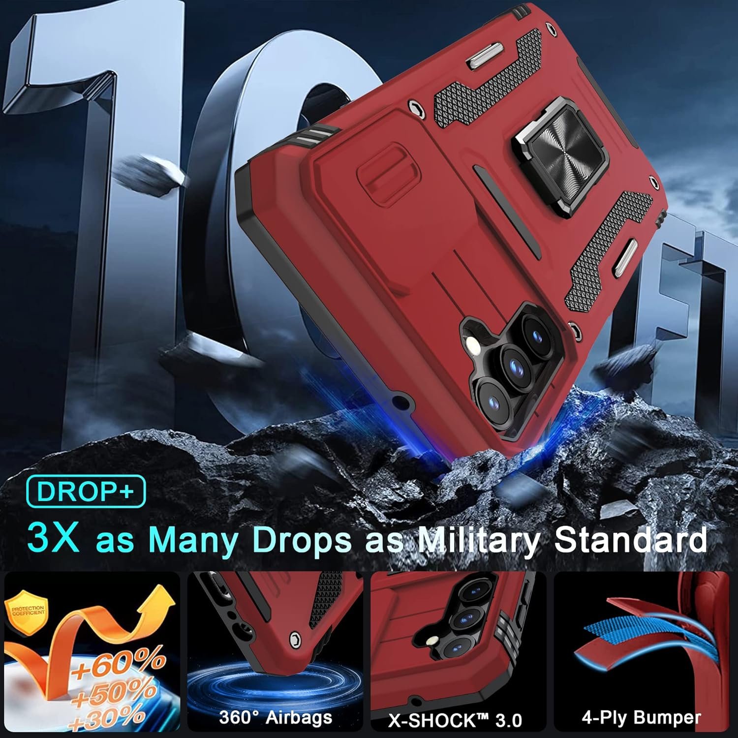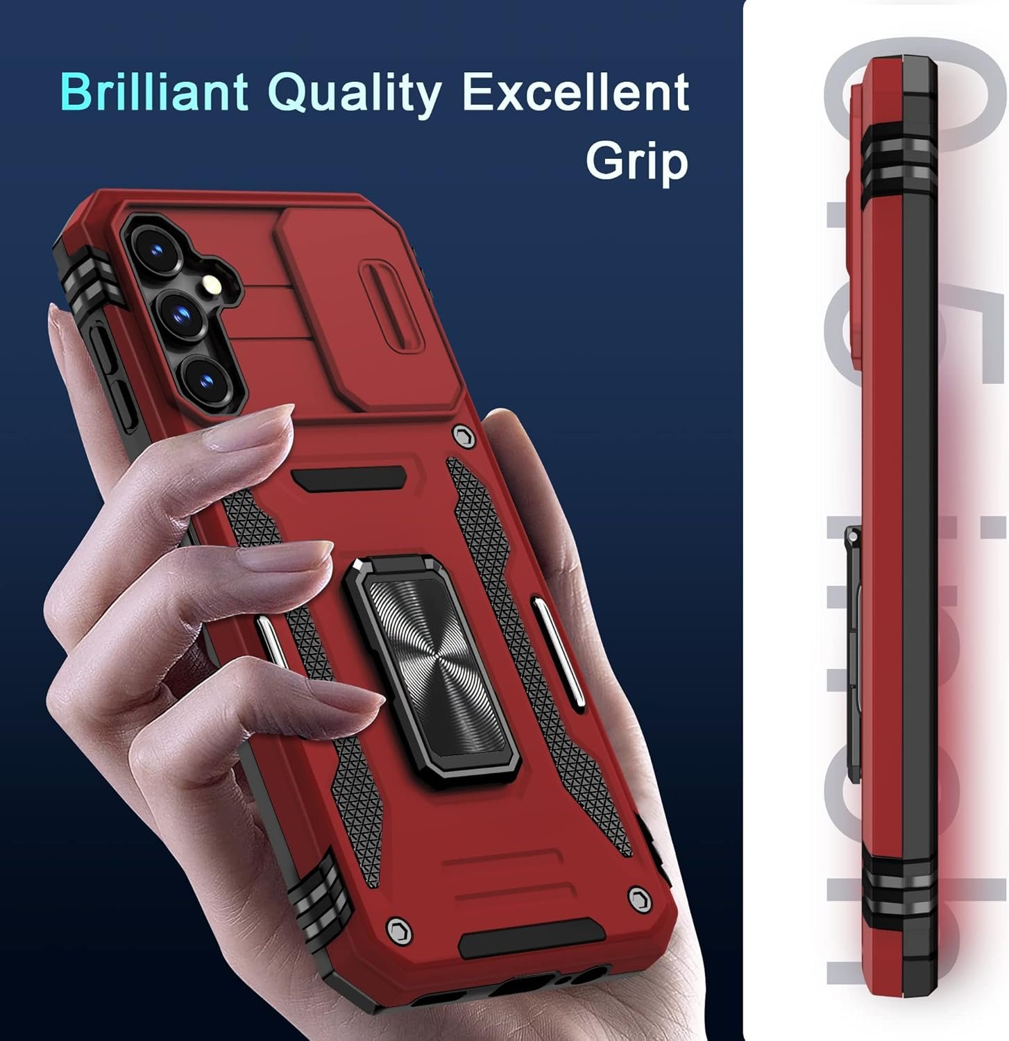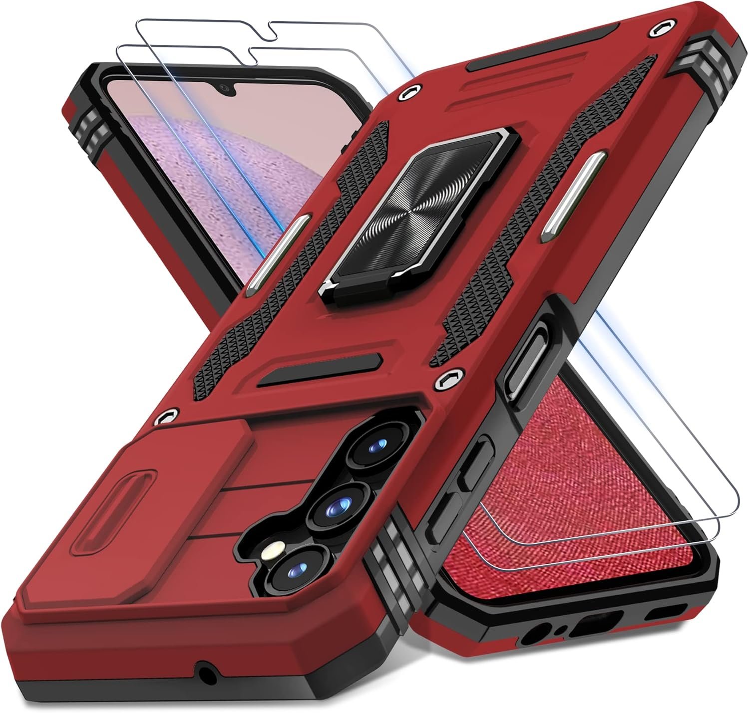 DEERLAMN Case for Samsung Galaxy A14 5G with Slide Camera Cover+Screen Protector(2 Packs),Rotated Ring Kickstand Military Grade Shockproof Protective Cover-Red