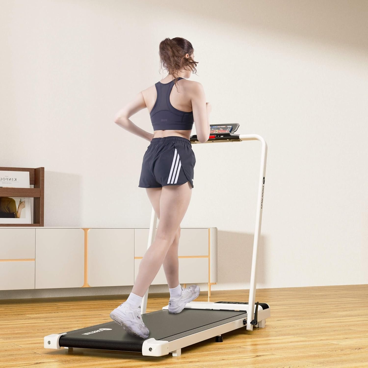 Upgrade 3 in 1 Foldable Treadmill: The speed range of the under desk treadmill is 0.6-7.5mph. When the riser is folded, it can be used as a walking pad treadmill under desk at a speed of 0.6-3.8mph. When the handrail is raised, it can be used as the running speed is 0.6-7.5mph. You can use the remote control to change the speed or stop the walking pad
