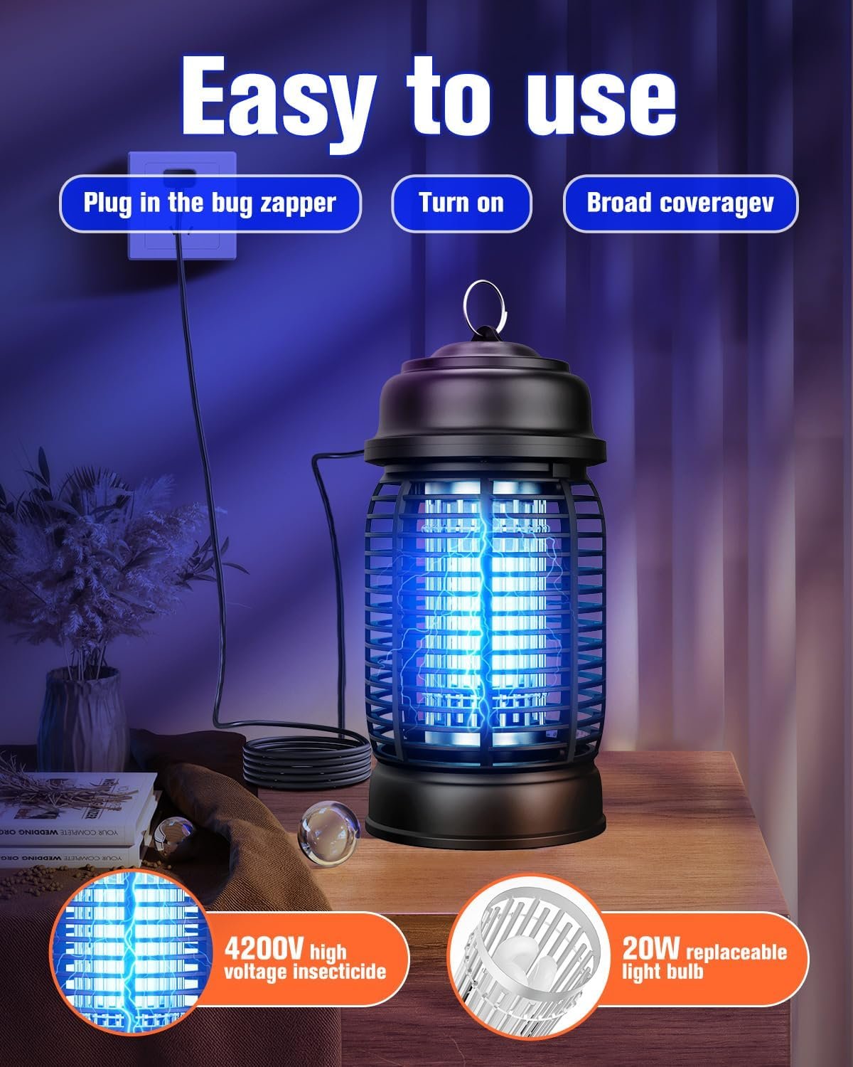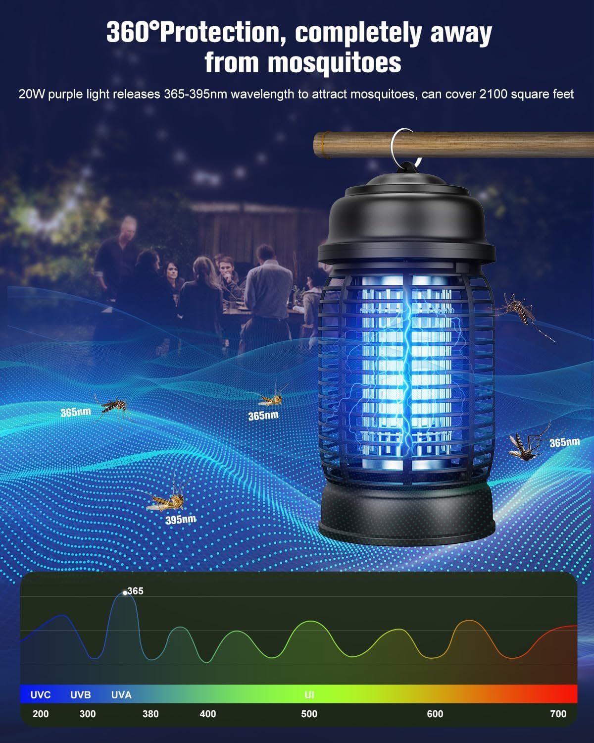 ⚡Efficient Physics Bug Zapper:The outdoor mosquito zapper is equipped with a 4200V high-voltage power grid and a 20W replaceable bulb. It uses 365nm wavelength ultraviolet light to lure mosquitoes, fruit flies, mosquitoes, moths, and small flying insects into the device, and then physically shocks them through the 4200V high-voltage power grid. Effectively kills and repels mosquitoes, gnats, Aedes, flies, moths and other flying insects