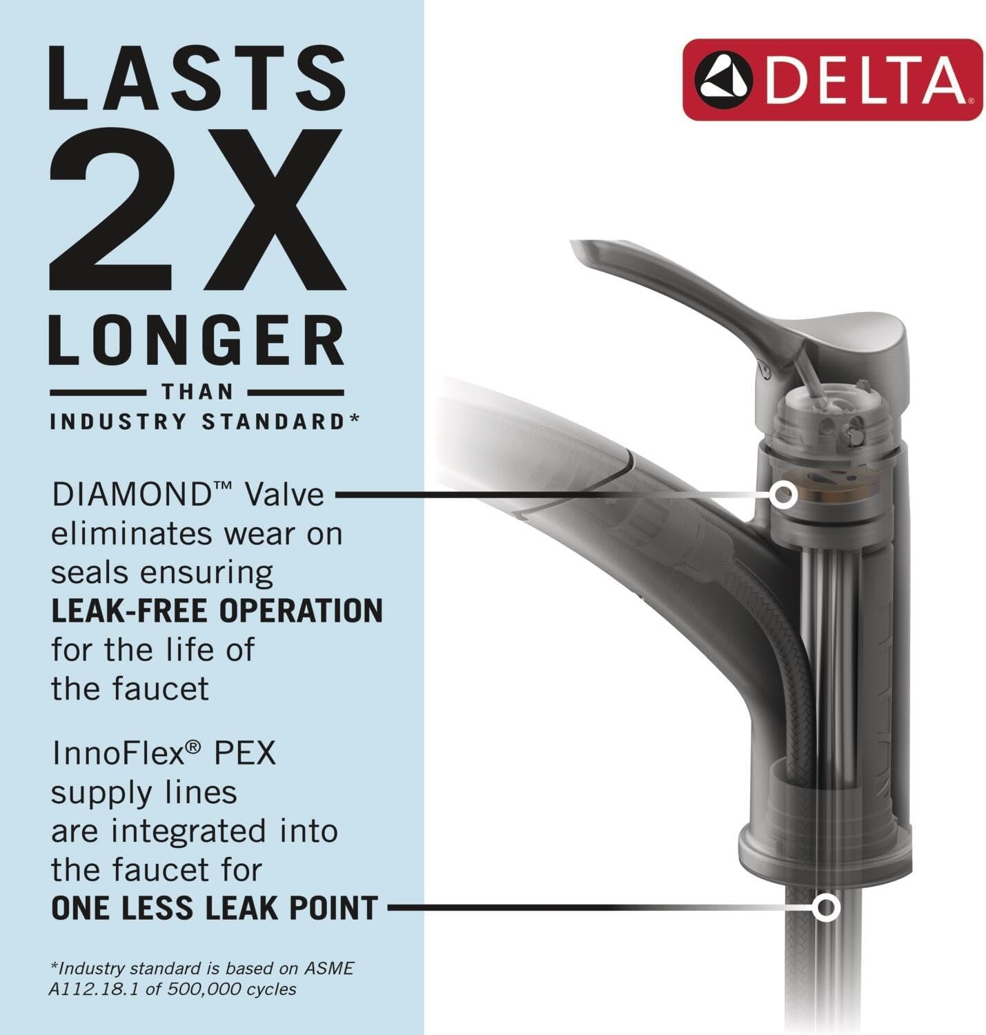LASTS 2X LONGER: Patented DIAMOND Seal Technology reduces leak points and lasts twice as long as the industry standard—ensuring leak-free operation for the life of the kitchen sink faucet