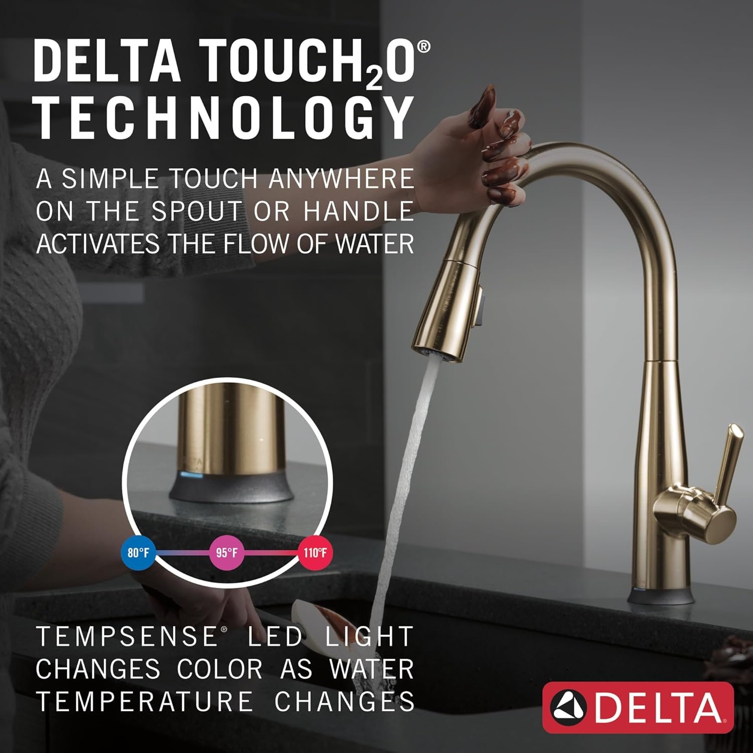 TOUCH ON. TOUCH OFF. Messy hands? Touch anywhere on the kitchen spout with your wrist or forearm to start and stop the flow of water or use the single lever handle manually. Check your water temperature from across the room using the TempSense LED indicator light