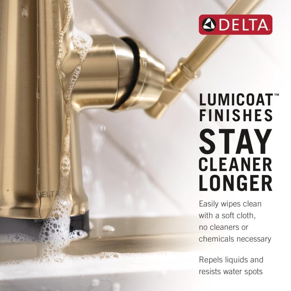 RESISTS WATER SPOTS: Delta Lumicoat finishes easily wipe clean, repel liquids, and are guaranteed to resist mineral buildup and hard water stains on your pull down kitchen faucet