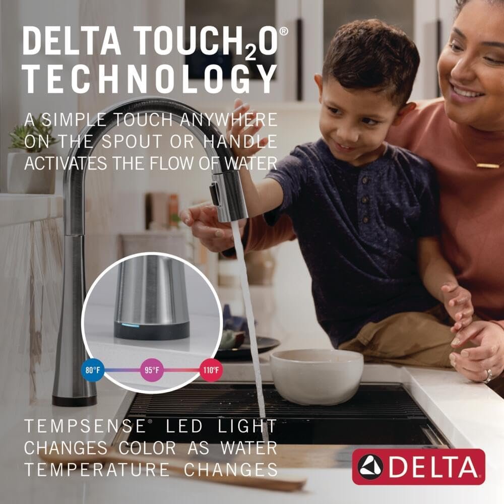 The Monrovia™ Kitchen Collection stands out in any space with its statuesque form and striking handle design. Touch it on. Touch it off. Whether you have two full hands or 10 messy fingers, Delta® Touch2O® Technology helps keep your kitchen faucet clean, even when your hands aren’t. A simple touch anywhere on the spout or handle with your wrist or forearm activates the flow of water at the temperature where your handle is set. The Delta TempSense® LED light changes color to alert you to the water’s temperature and eliminates any possible surprises or discomfort. You can install with confidence, knowing that Delta kitchen faucets are backed by our Lifetime Limited Warranty. Electronic parts are backed by our 5-year electronic parts warranty.