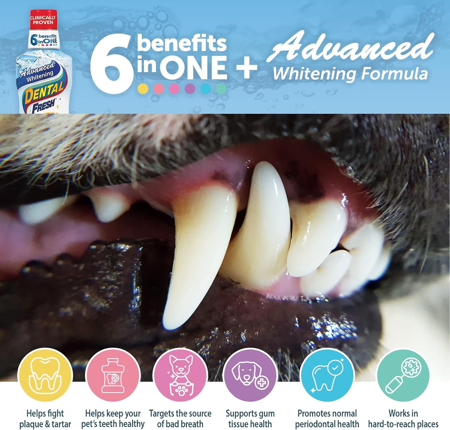 Don’t let pet breath keep you away! Taking care of your cat or dog’s oral health has never been easier. Dental Fresh Advanced Whitening Water Additive is truly the world’s first toothbrush in a bottle. Adding it to your pet’s water is like brushing their teeth every time they drink – without the struggles that most pet parents face when trying to use a dog toothbrush and toothpaste or dog tooth brushing kit on an unwilling pet. Dental Fresh dog teeth cleaning water additive is beneficial to clean your pet’s teeth and freshen their breath all while helping to reveal your pet’s naturally white smile. When dogs and cats develop dental disease, it can lead to additional problems throughout their body. That is why it is so important to recognize the signs of dental issues in your pet – bad breath, yellow or brown teeth, swollen, red gums, weight loss, and poor appetite – and prioritize oral health. All of the pets in your household can drink from the same water bowl since Dental Fresh has been formulated for dogs and their feline friends. Unlike many water additives on the market, Dental Fresh contains no alcohol, no sugar, no surfactants or detergents, or artificial flavorings. We know that your dogs and cats are more than just pets – they are part of the family – so Dental Fresh formulates premium oral health products that pet parents can actually afford. Your pet will have fresher breath, whiter teeth, and healthier gums and you will feel confident knowing that you are being proactive with your pet’s oral health – making you both happy and able to focus on more important things like walks, games and snuggles.