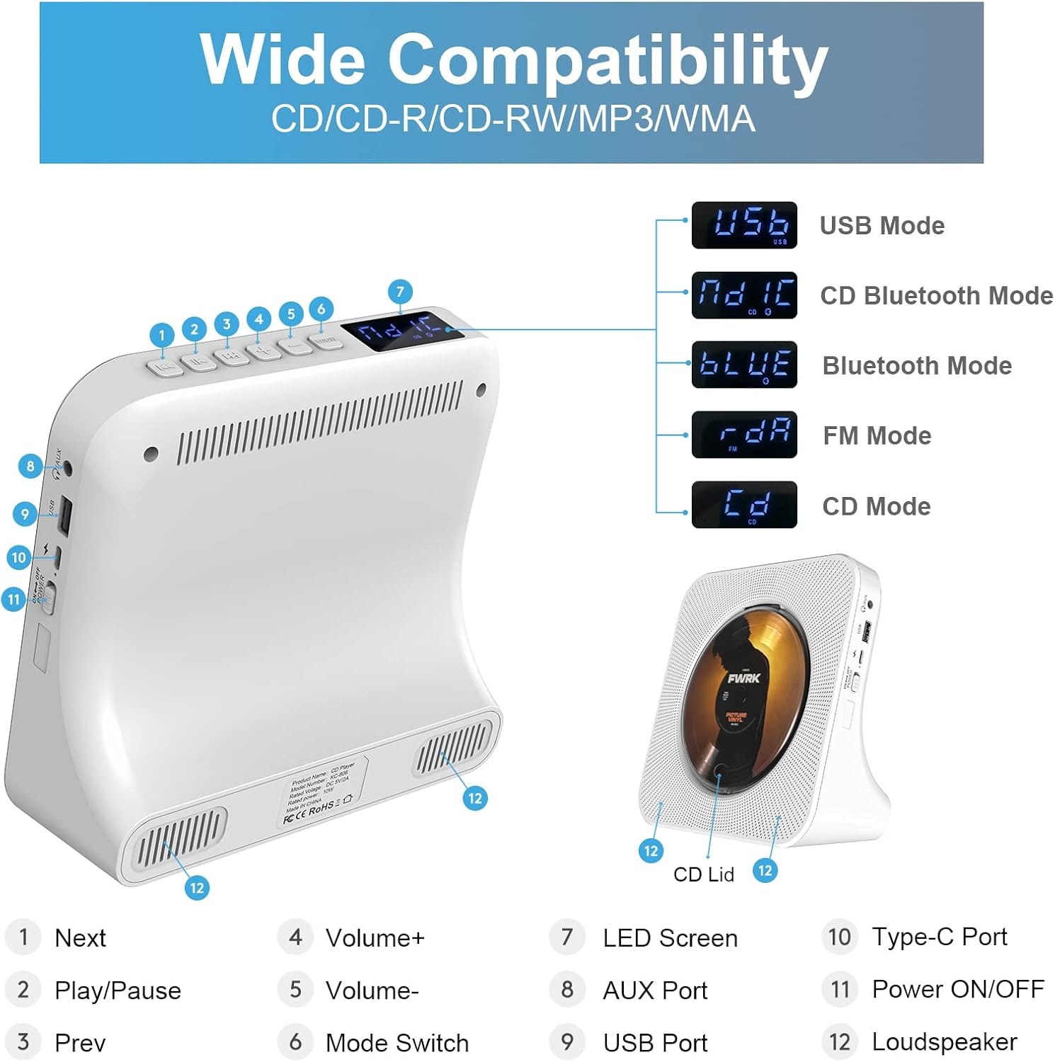 ⊙ Latest Upgraded Desktop Vertical Design, Body buttons and IR remote control, The Cute CD Player is Easy to Place, Easy to Operate, Easy to Use(Tips:Wired Powered)