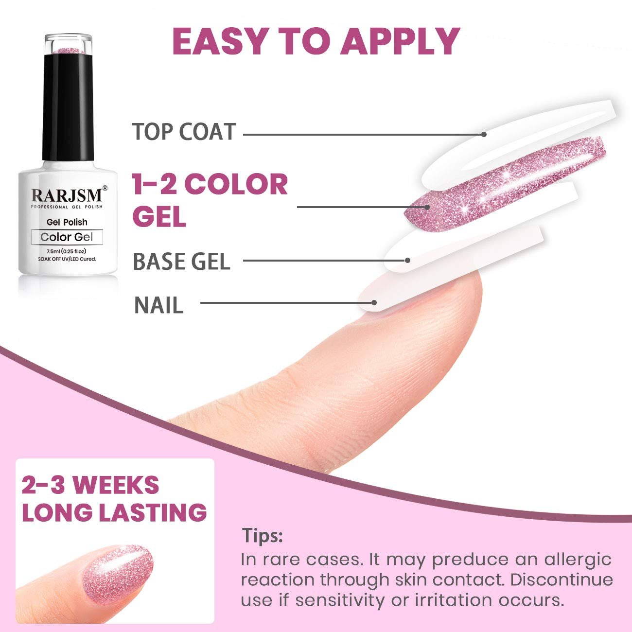 NAIL LAMP REQUIRED:RARJSM glitter gel polish need to cured under UV/LED nail lamp.With proper application this low odor shimmer glitter gel polish can keep perfect more than 2 weeks.It’s a highly-pigmented, long-lasting polish that won’t chip or smudge.No harsh ingredients or adhesives with low smell, rich color, middle consistency, self-evenly, no shrink and edge