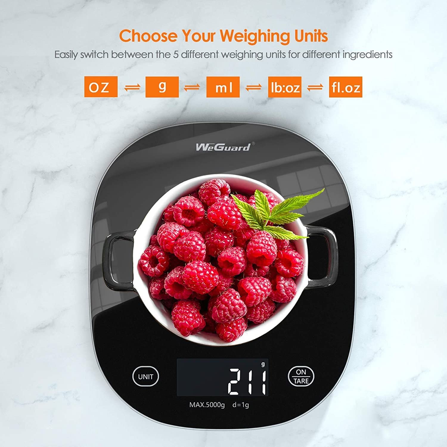 【Reliable Accuracy with Five Units】🎯 WeGuard scale for food equipped with 4 Auto-calibrating sensors provides reliable accuracy, weigh anything between 2g and 5000g in measurement increments of 1g / 0.05oz. Easily convert five units to oz, lb: oz, g, ml, fl.oz to meet the weighing requirements of various ingredients.