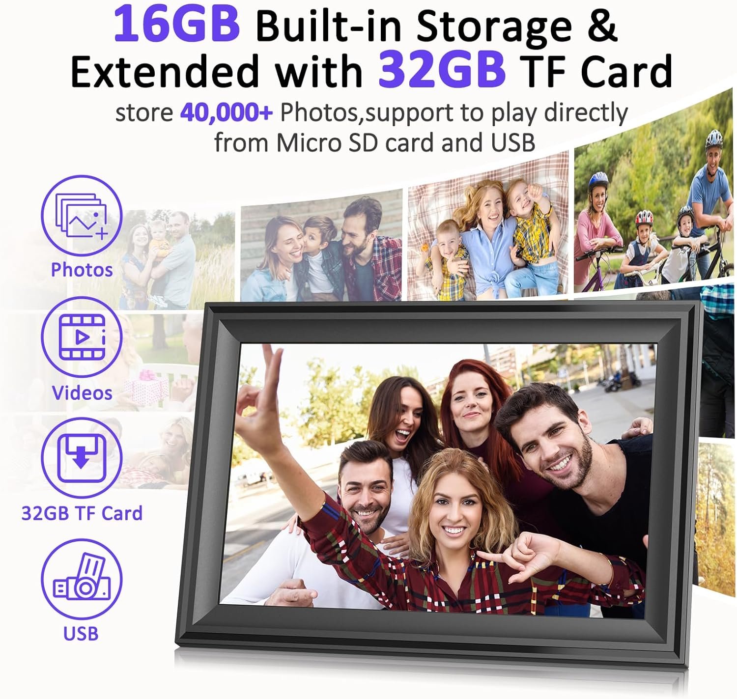 【16GB Storage & 32GB Extended Support】Built-in 16GB memory and extend 32GB micro SD card (only FAT32 format, card is not included) empowers a huge capability of storage. Supports non-WiFi transmission by importing, exporting or directly playing photos and videos from micro SD Card or USB Drive(need Type-C connector). Supports multiple image formats including JPG/JPEG/BMP/PNG, and video format by MP4.