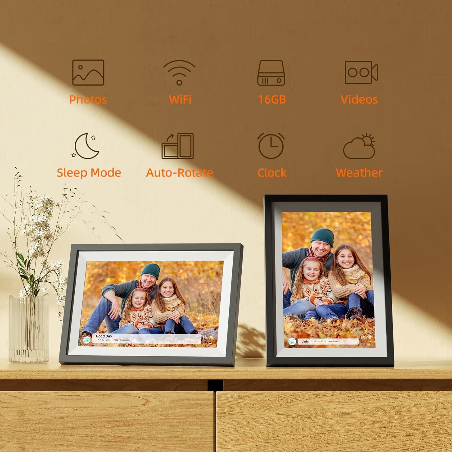 【10.1-inch IPS HD touchscreen】The Digital Photo Frame WiFi is equipped with a 10-inch HD 1280 x 800 IPS full-viewing angle touch screen, with 16:10 aspect ratio, and comes with a removable stand and mounting holes that allow you to display it vertically, horizontally, or hanging, and the photos will automatically rotate to adjust the orientation according to the way you place them. This digital frame is an ideal gift for seniors.
