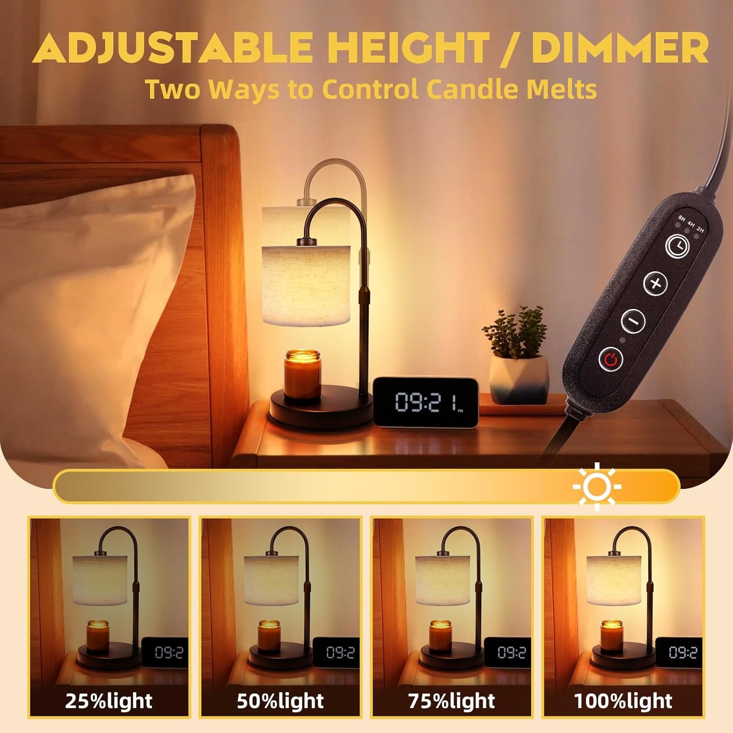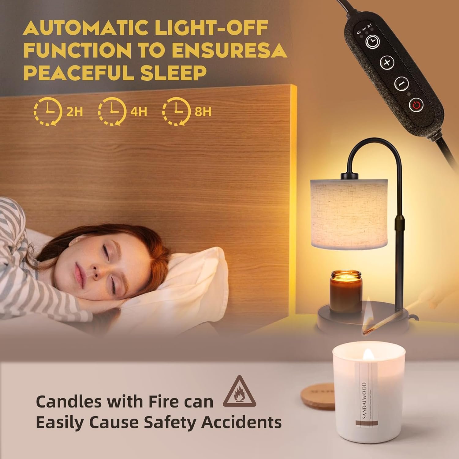 [Features and Advantages]The candle warmer lamp features stepless dimming and adjustable pole, allowing you to adjust the brightness and height to control the candle’s temperature and the fragrance intensity.Additionally, the lamp offers 2-hour, 4-hour, and 8-hour automatic shut-off timer options, so you can enjoy the fragrance without worrying about forgetting to turn it off, making it easy to drift off to sleep or move about freely.