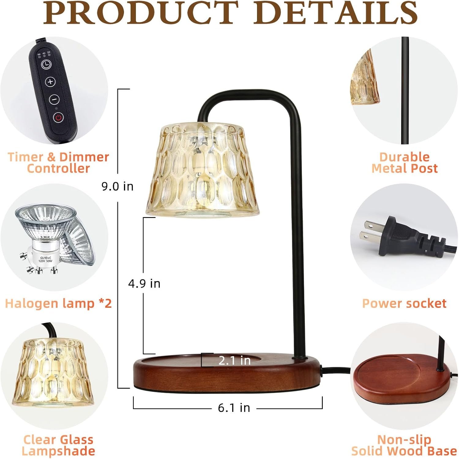 [Excellent Work Functional ]: Our electric candle warmer lamp with timer utilizes 35-watt halogen warming bulbs (included), gently melting the candle from the top down to bottom. With no open flame, no need concerns of flame, smoke, soot, and pollution, the candle warmer is good to people and environment. Moreover, no-slip pads have been added under the wooden base for stability, making you feel safe when using this candle lamp warmer.
