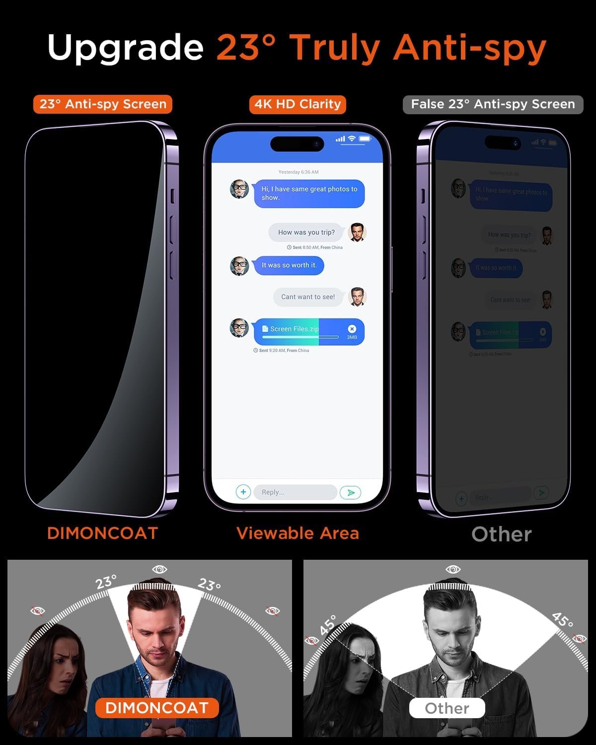 STEALTH HD PRIVACY SCREEN, REDEFINING YOUR EXPECTATIONS OF PRIVACY GLASS】This pioneering protector offers an ultra-narrow 23° privacy angle, providing a broad 130° anti-spying range. In any setting, onlookers will see nothing but a deep black screen. Thanks to advanced AR technology, the screen delivers the clearest screen visibility on the market. You can enjoy an unparalleled HD experience, all while safeguarding your on-screen