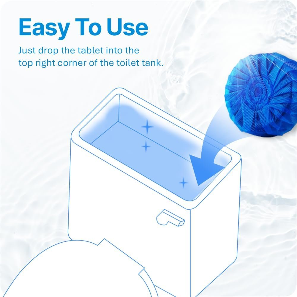 EASY TO USE: Take out one tablet from the SELF-STANDING RESEALABLE bag and drop it into the toilet tank. Then, leave it to dissolve sufficiently for at least 30 minutes until the water turns blue before flushing. (Please do not remove the water-soluble transparent protective film.)