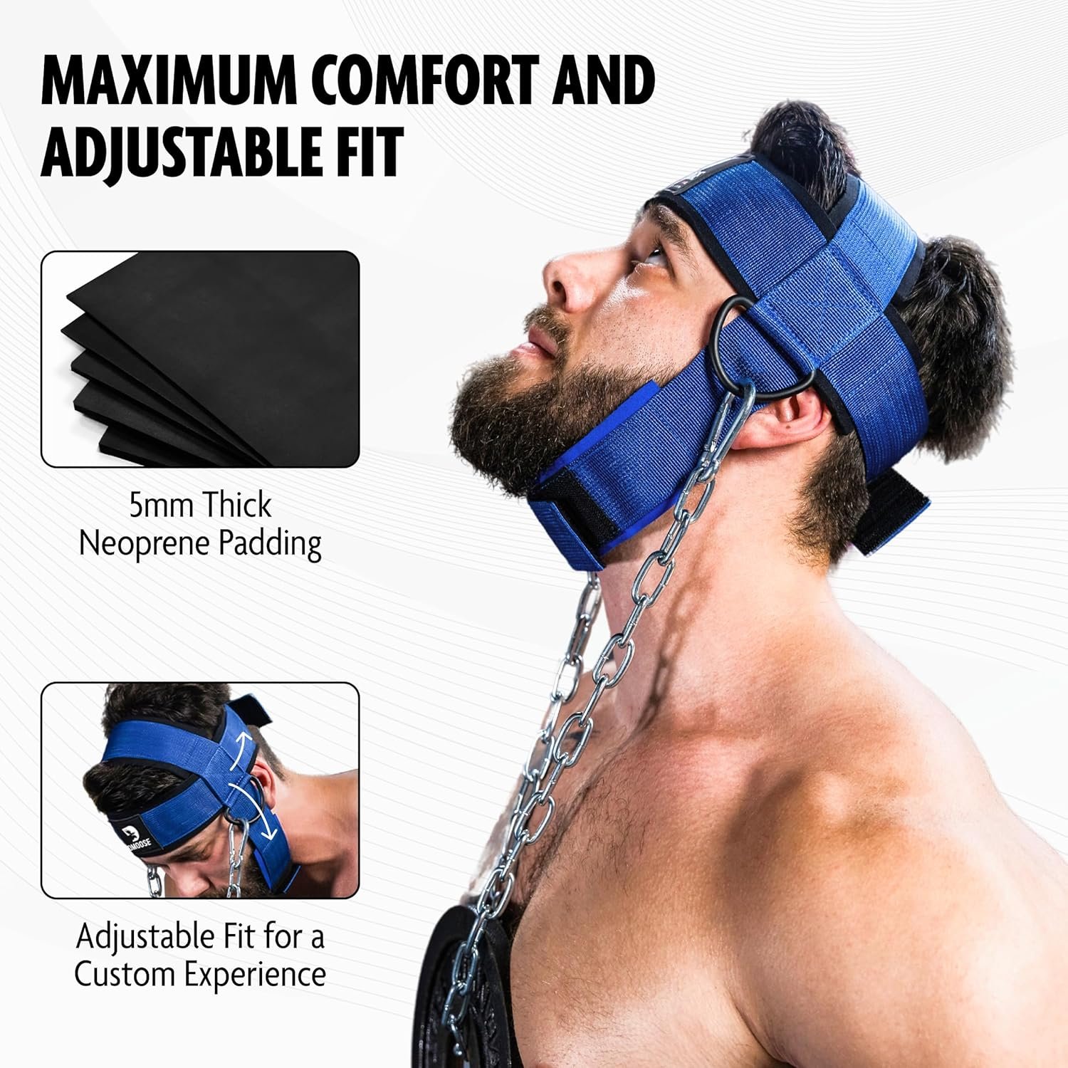 𝐌𝐀𝐗𝐈𝐌𝐔𝐌 𝐂𝐎𝐌𝐅𝐎𝐑𝐓 𝐖𝐈𝐓𝐇 𝟓𝐌𝐌 𝐓𝐇𝐈𝐂𝐊 𝐍𝐄𝐎𝐏𝐑𝐄𝐍𝐄 𝐏𝐀𝐃𝐃𝐈𝐍𝐆: Comfort is key when it comes to neck training, and the DMoose Neck Head Harness delivers with its 5mm thick neoprene padding. This soft yet supportive padding reduces strain and discomfort during your workouts, allowing you to focus on building strength without worrying about irritation or chafing. The neoprene padding also helps distribute weight evenly, ensuring a balanced and effective workout every time.
