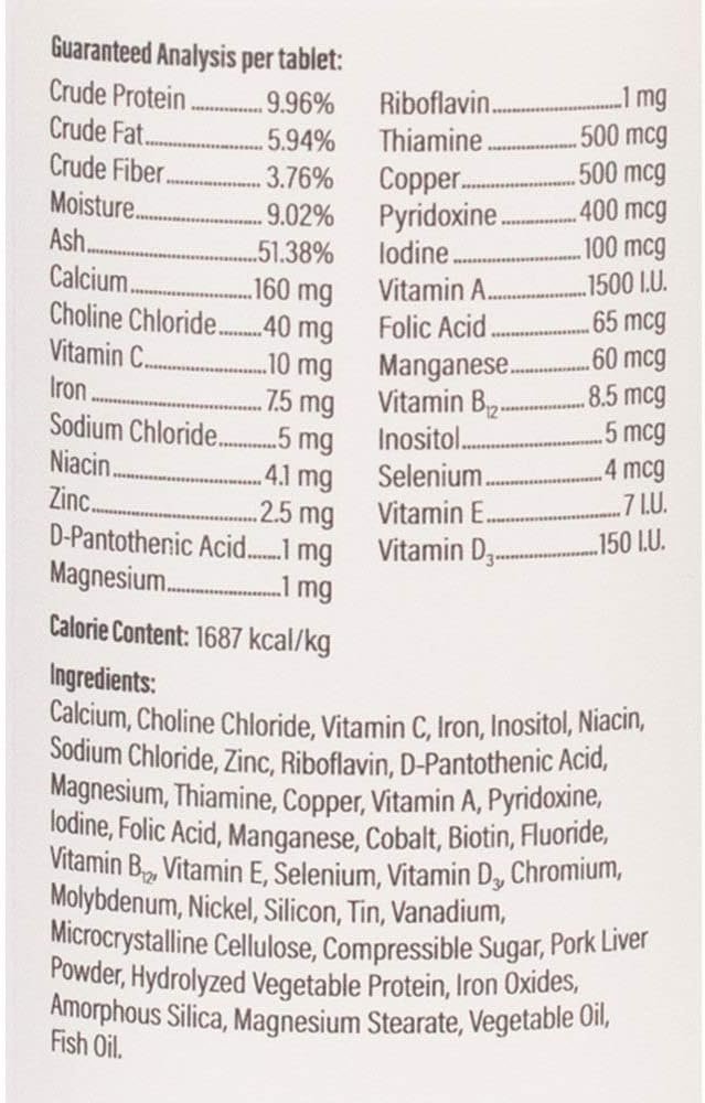 INGREDIENTS – include, but are not limited to, fish oil, calcium, and Vitamins C, B12, and D3; formulated with an artificial roast beef and liver flavoring