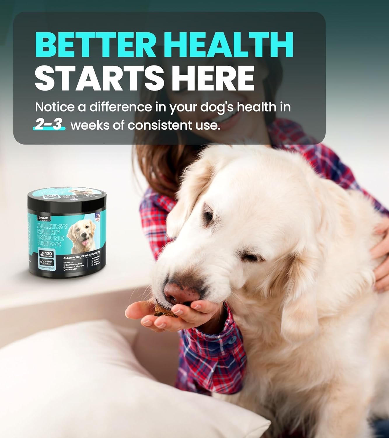 END THE ALLERGY STRUGGLE: YOUR PUP DESERVES A HEALTHIER LIFE! Nothing can you do when your dog itches, scratches, sneezes? Made of prebiotics, licorice root, vitamins, and apple cider vinegar, OMIKEE dog allergy chews target allergies and boost the immune system. These dog allergy chews can also soothe skin inflammation and fortify cells against allergens. Simply incorporate a few OMIKEE chews into your pup’s daily diet for three weeks to see results!