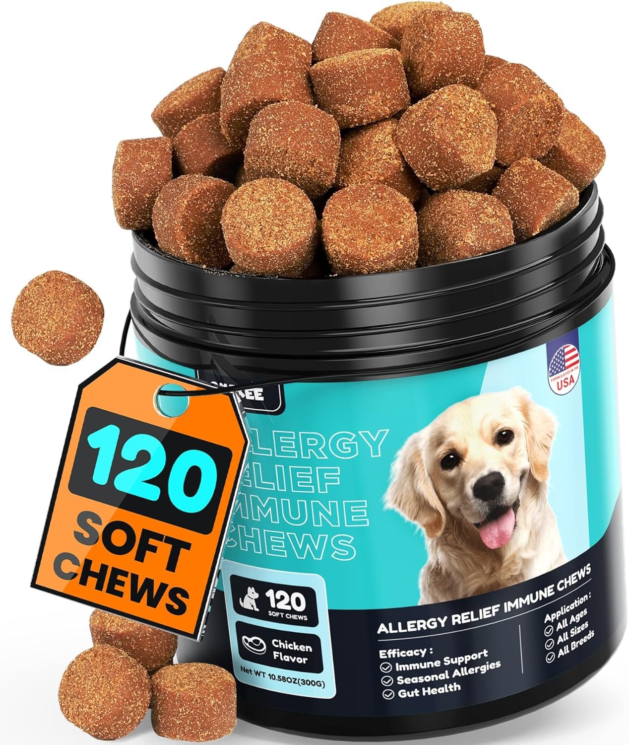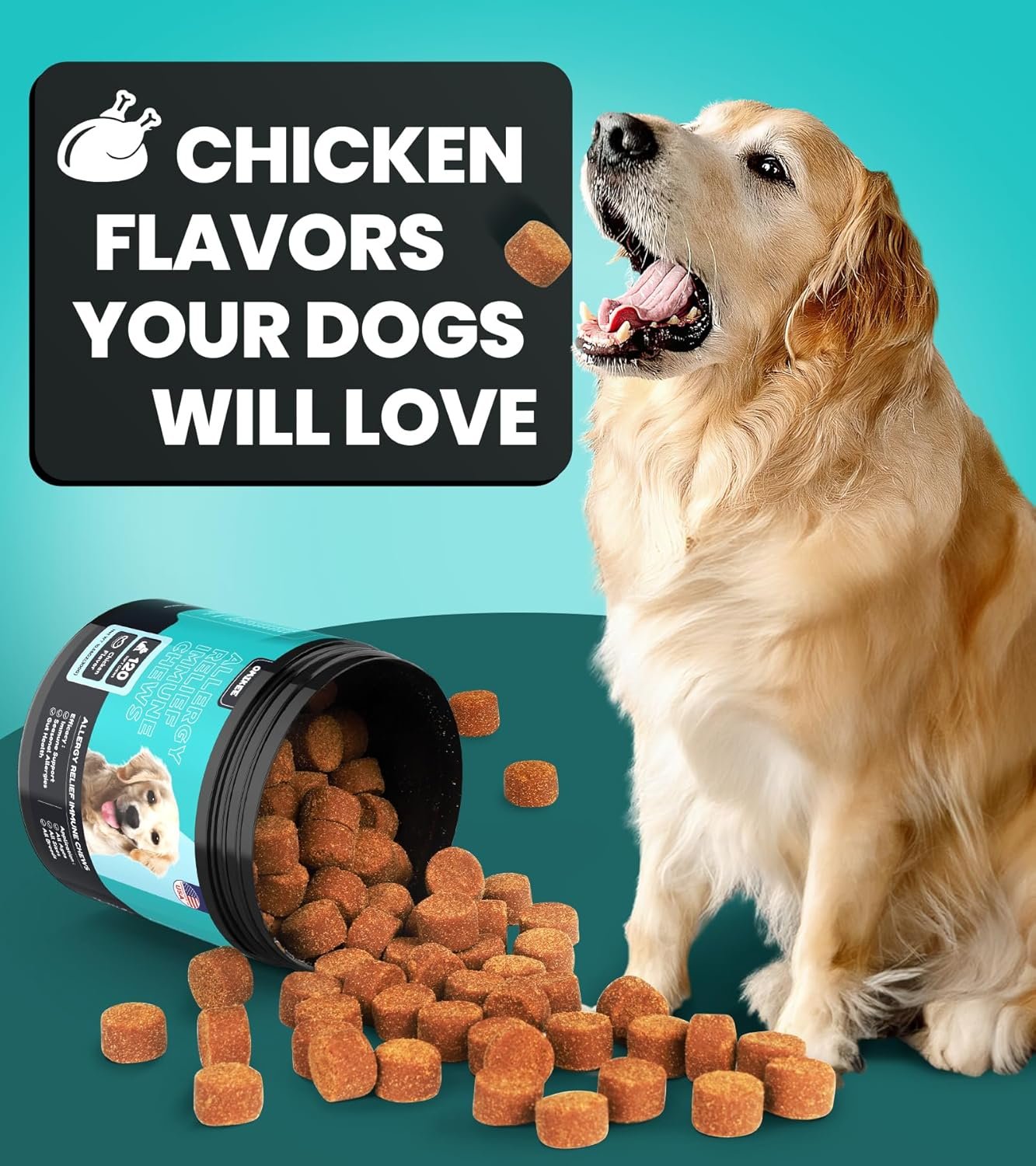 TIRED OF SPENDING THOUSANDS ON VET BILLS FOR TEMPORARY SOLUTIONS? Tackle itching, paw licking, hot spots, and seasonal allergies with one easy to use our nutritional allergy supplement! 120 delicious chicken-flavored supplements that blend well with food and can be taken with a meal. No matter what your dog’s breed, size, or age, they’re sure to love these delicious allergy immune supplement.
