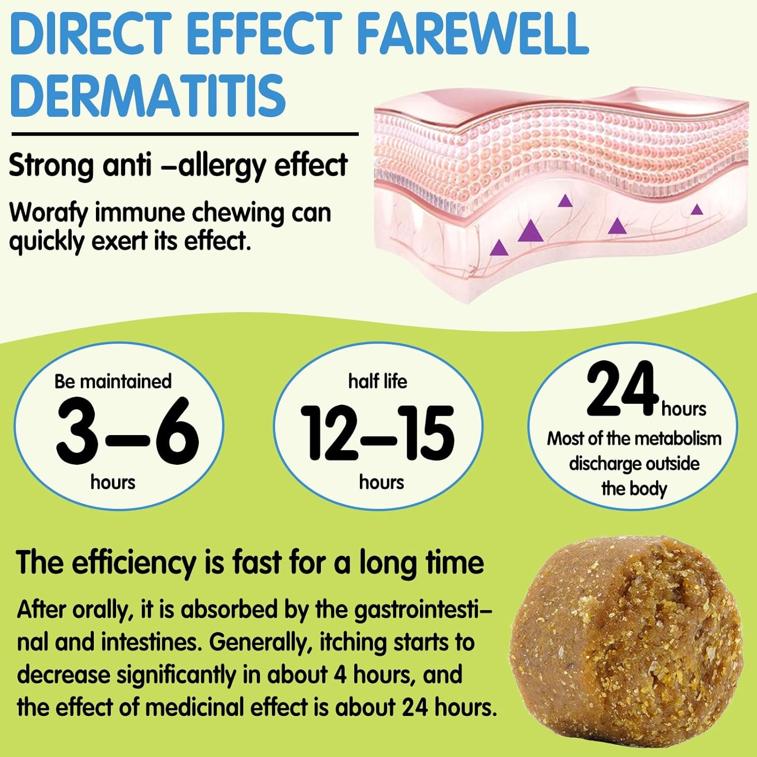 🐕【All Breeds & Ages】: Dog allergy chews under 25lbs eat 1 soft chew/day, 25-50lbs eat 2 soft chews/day, 51-70lbs eat 3 soft chews/day, 71-90lbs eat 4 soft chews/day, over 90lbs eat 5 or 6 soft chews/day. (The daily amount can be divided between AM and PM)