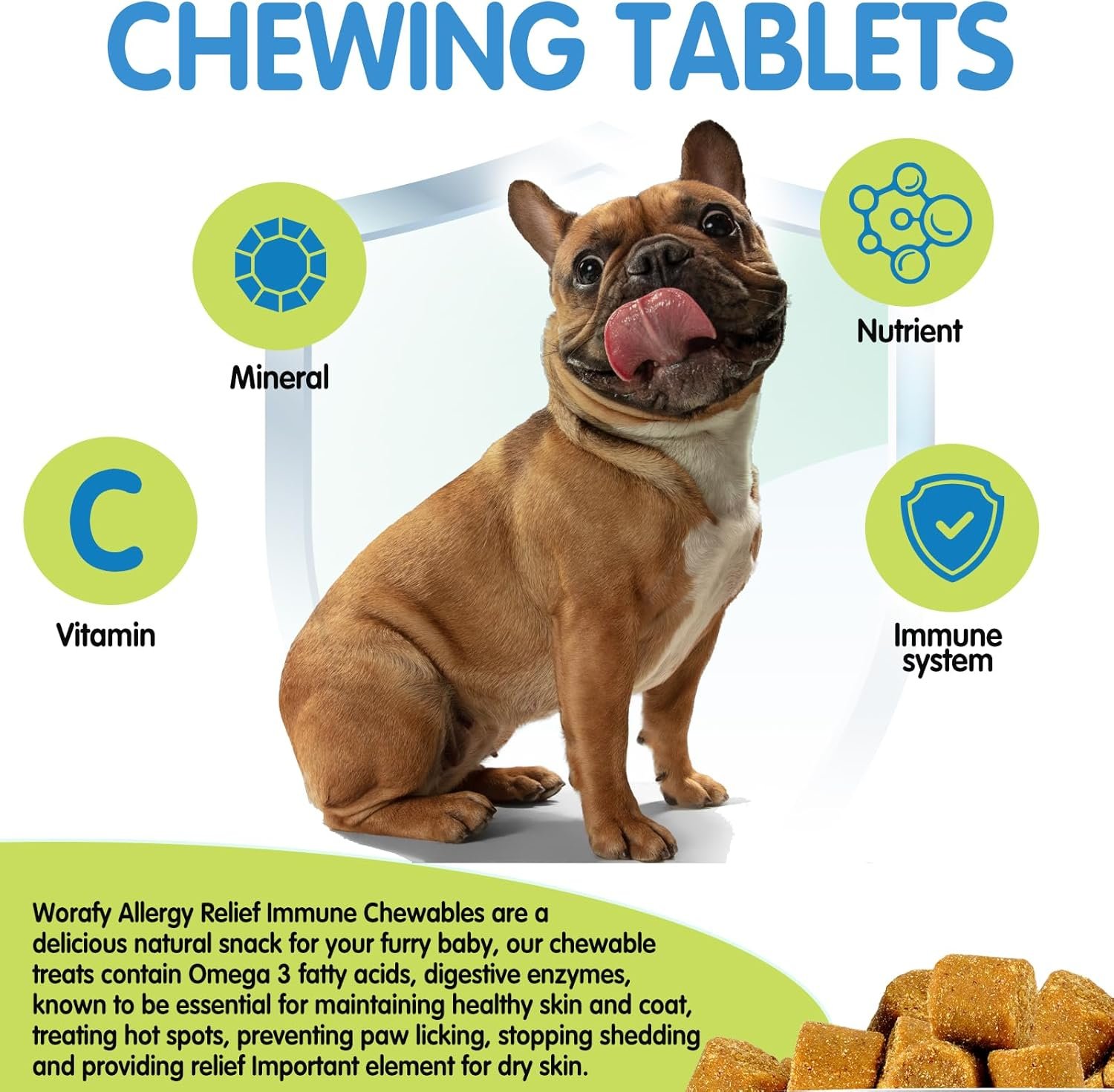 🦴【Natural Ingredients】: Allergy Relief Immune Chewables are rich in vitamins, minerals , nutrients, omega 3 fish oil,digestive enzymes, known to be essential for maintaining healthy skin and coat, treating hot spots, preventing paw licking, stopping shedding and providing relief Important element for dry skin.