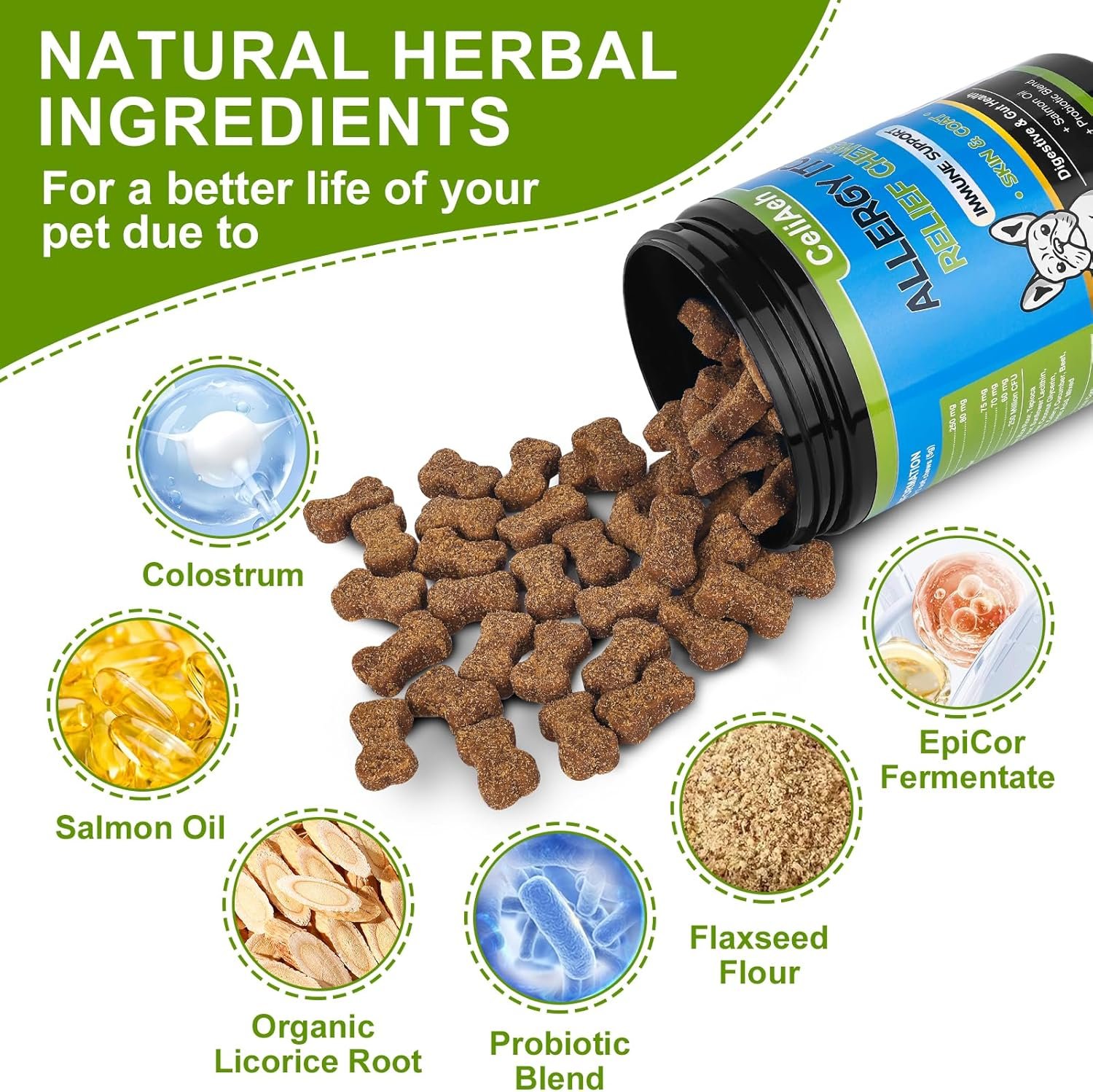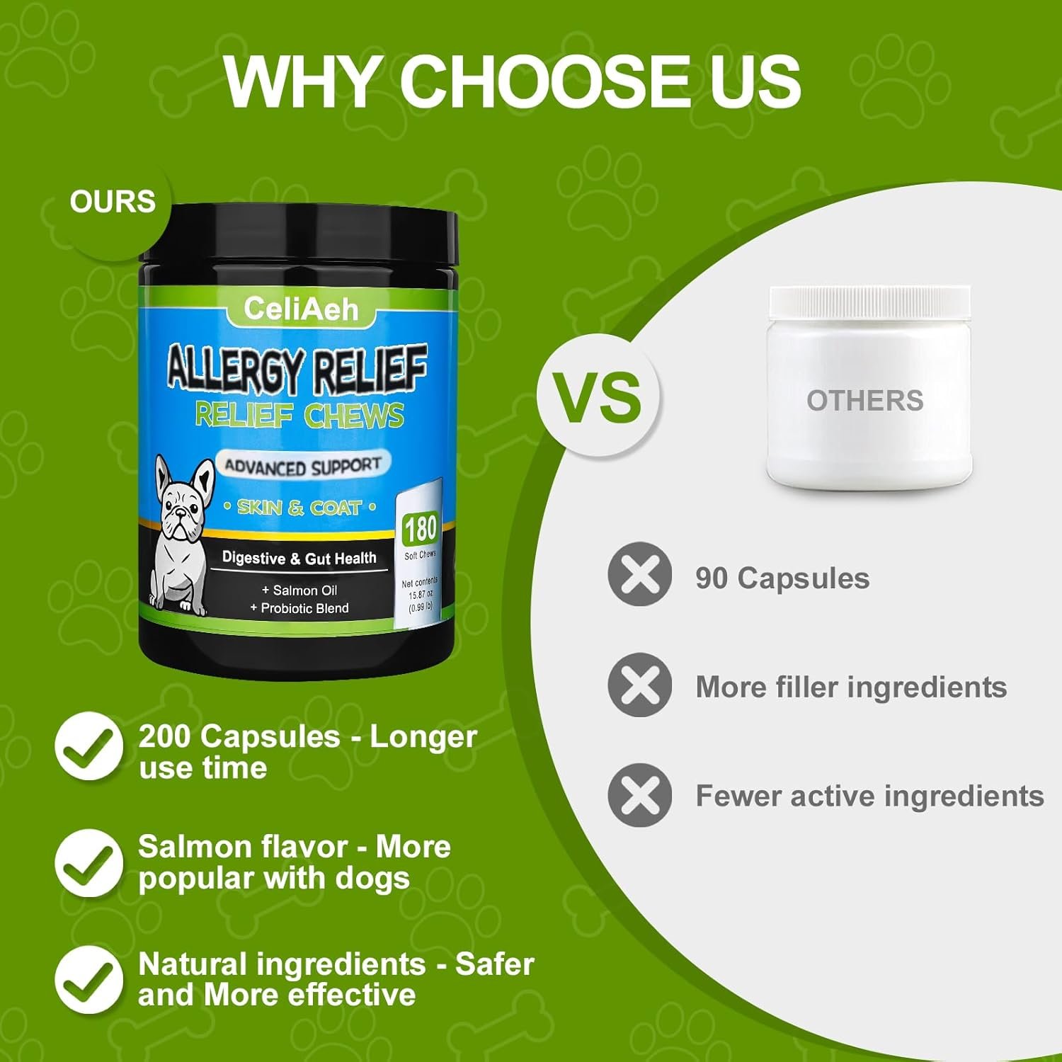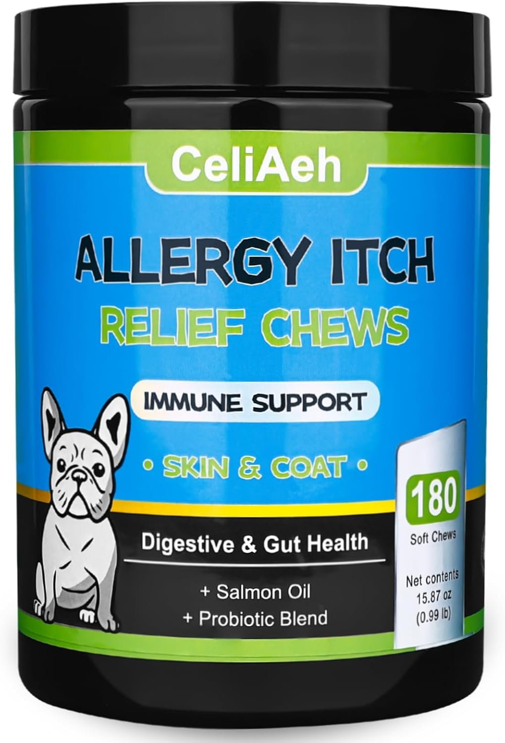 Longer Supply: 180 Itch and allergy chews for dogs itching and licking per jar, provide extended relief for dog itching skin and promote longer-term pet health. Allergy bites for dogs can help you stay free from expensive temporary veterinary costs. Probiotics for dogs are suitable for small and large pets of all breeds and ages. Please follow the instructions when giving your dog allergy treats. Embrace the outdoors happily with CeliAeh dog allergy itch chews! Your pup deserves a healthier life!