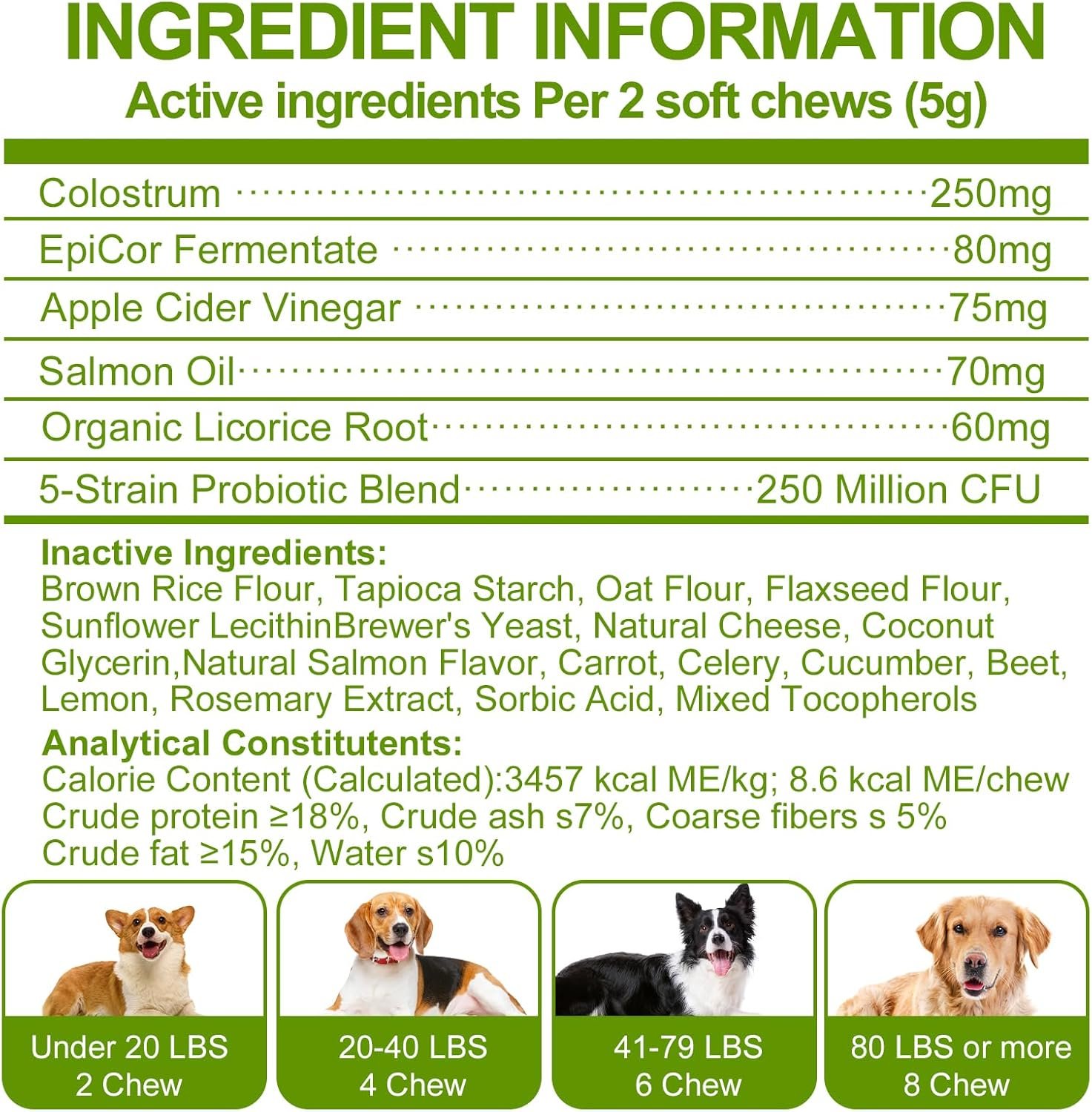 Vet Recommended Dog Allergy Relief Chews: These anti itch for dogs supplements are manufactured with care using ingredients, not only help dog allergy relief, but also maintain dog health. Our dog itching skin relief chews offer not only anti-itch relief for dogs, but also colostrum and vitamins of dog itch relief chew help dogs maintain a healthy immune system, and promoting digestive health, and supporting immunity during seasonal allergies, ensuring your dog stays comfortable during allergy season