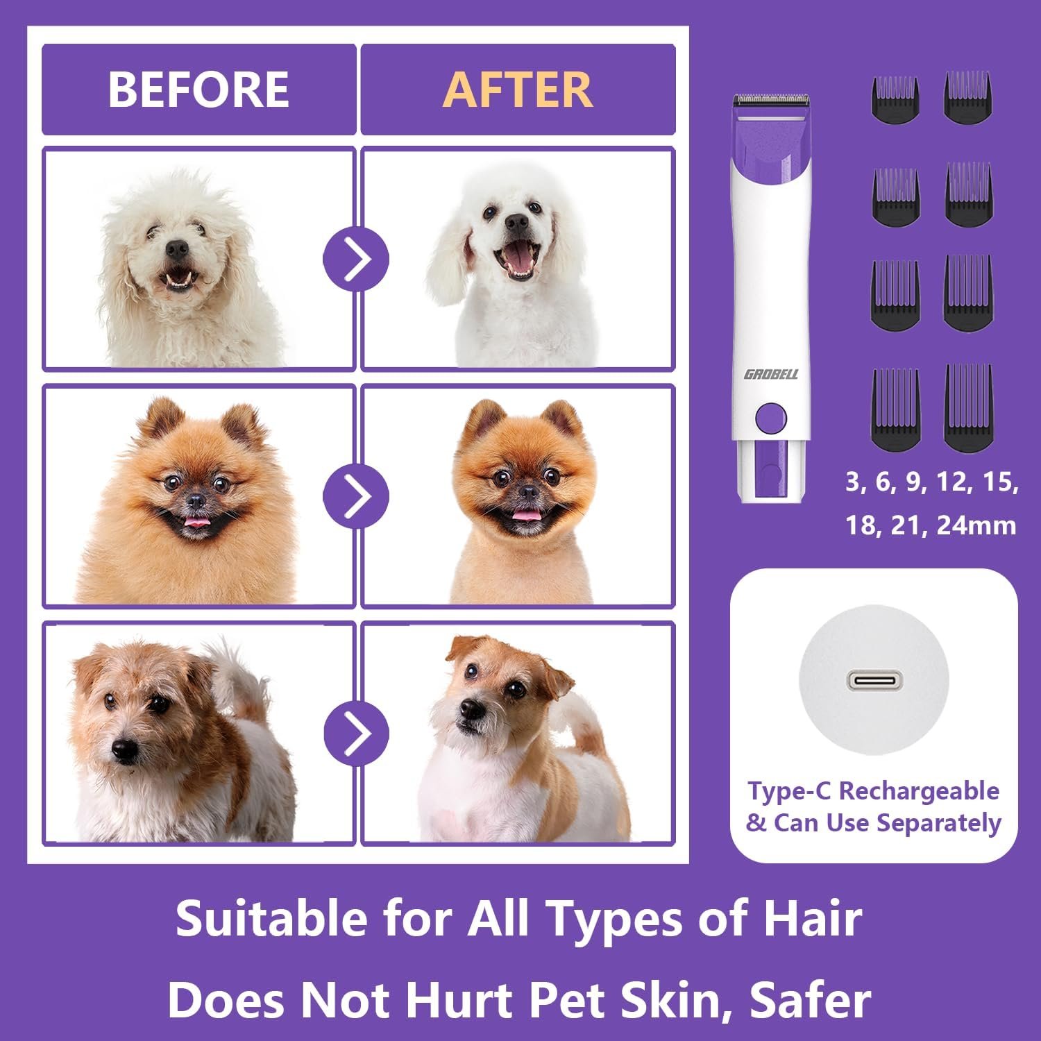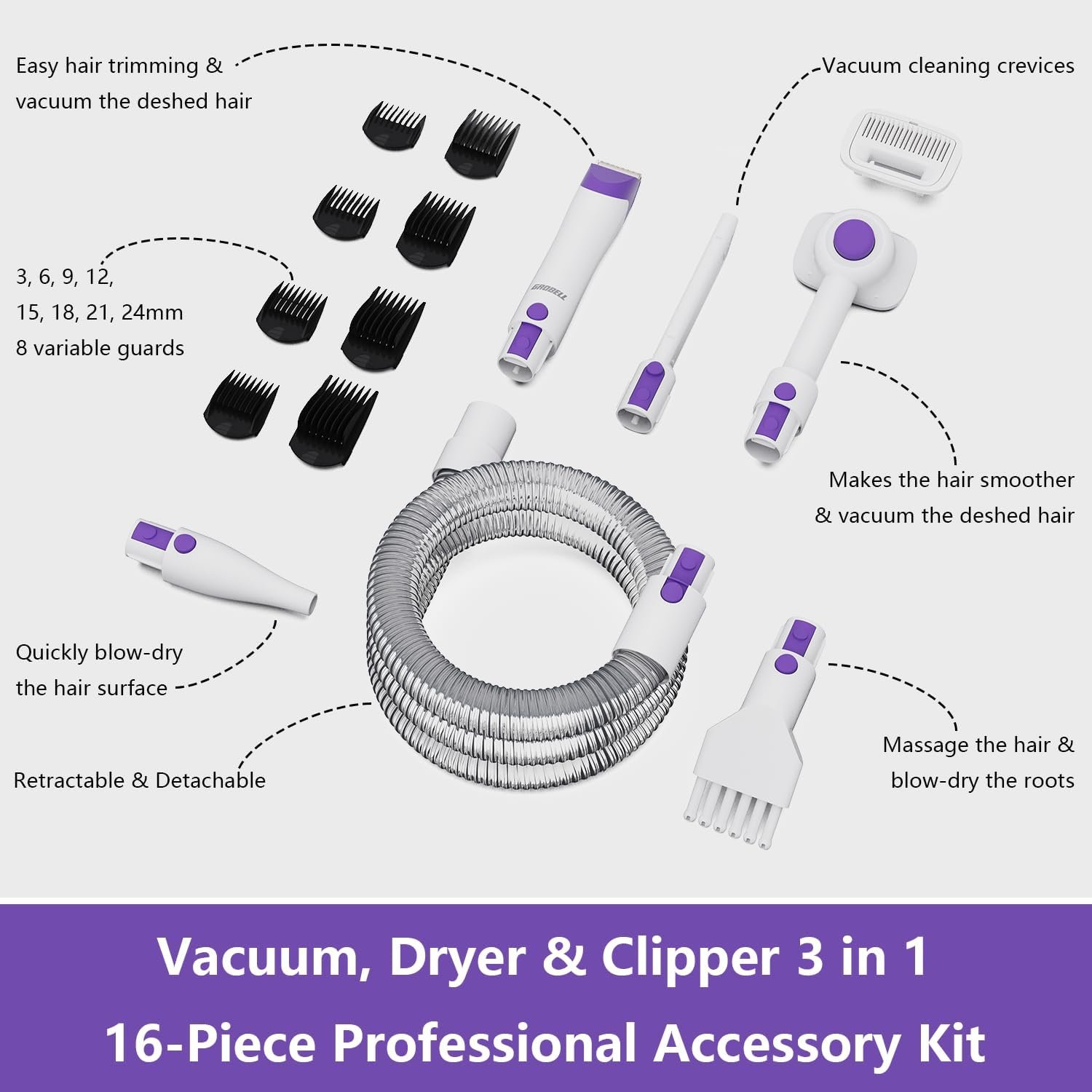 [GROBELL Pet Grooming Vacuum and Dryer Kit]: This kit has a capacity of 2.5 liters. The professional electric pet clipper comes with 8 adjustable length guide combs (3, 6, 9, 12, 15, 18, 21, 24 mm) suitable for long, short, thick, or curly pet hair. It features 3 levels of vacuum suction adjustment, a maximum suction power of 16000 Pa, and a 3-level hot air blower, with noise levels kept below 60 dB.