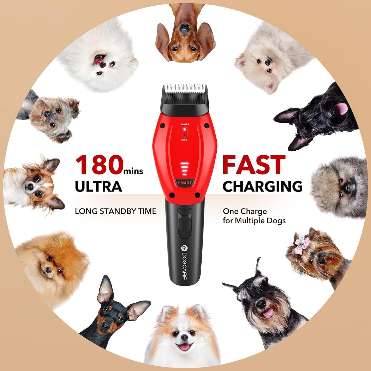 [Quiet Mode & Turbo Mode] Except for smart mode, DOG CARE hair clipper support quiet and turbo modes as well. The quiet mode runs at low noise and vibration, best for sensitive pets. The turbo mode is suitable for dogs with long and thick coats like German shepherds