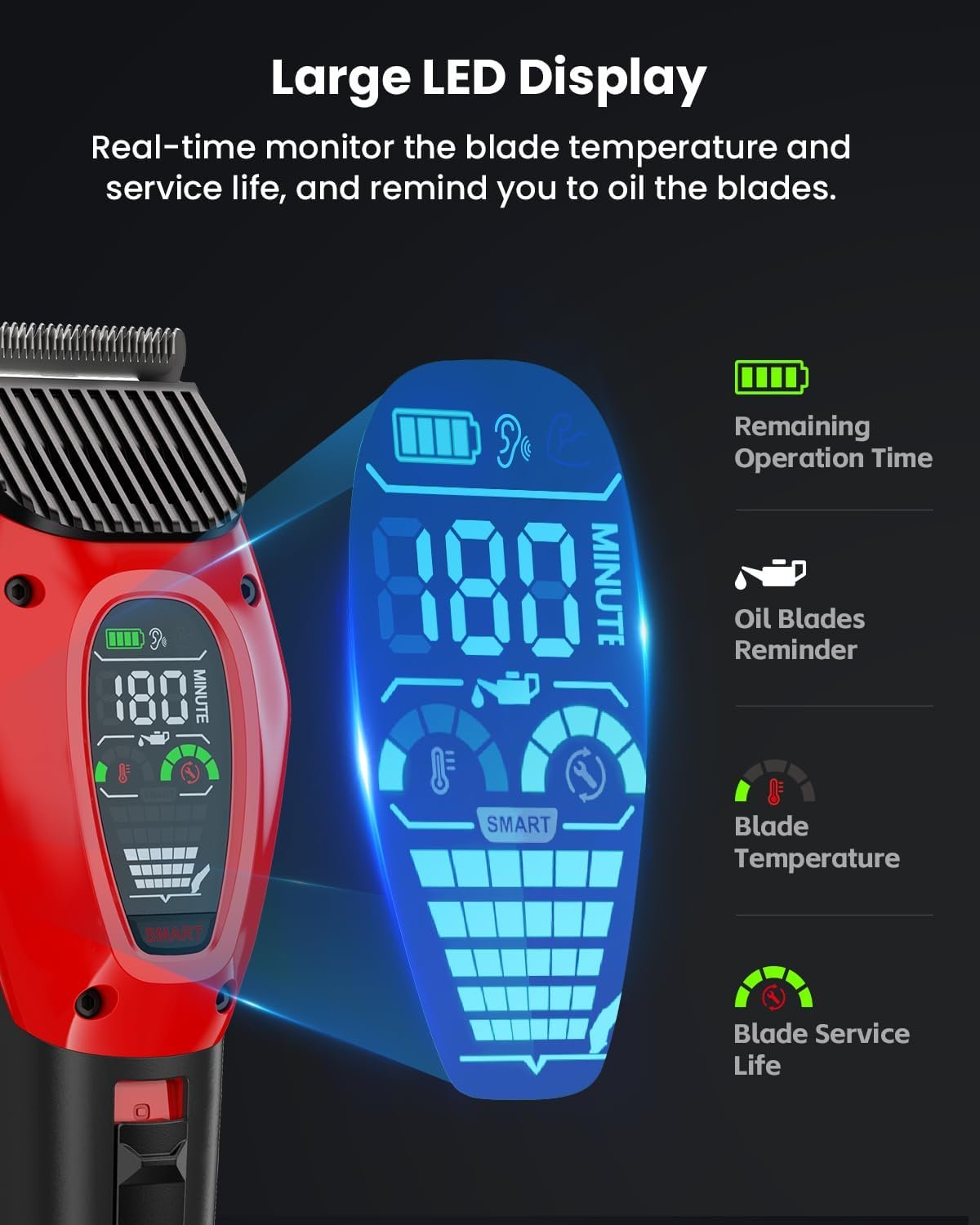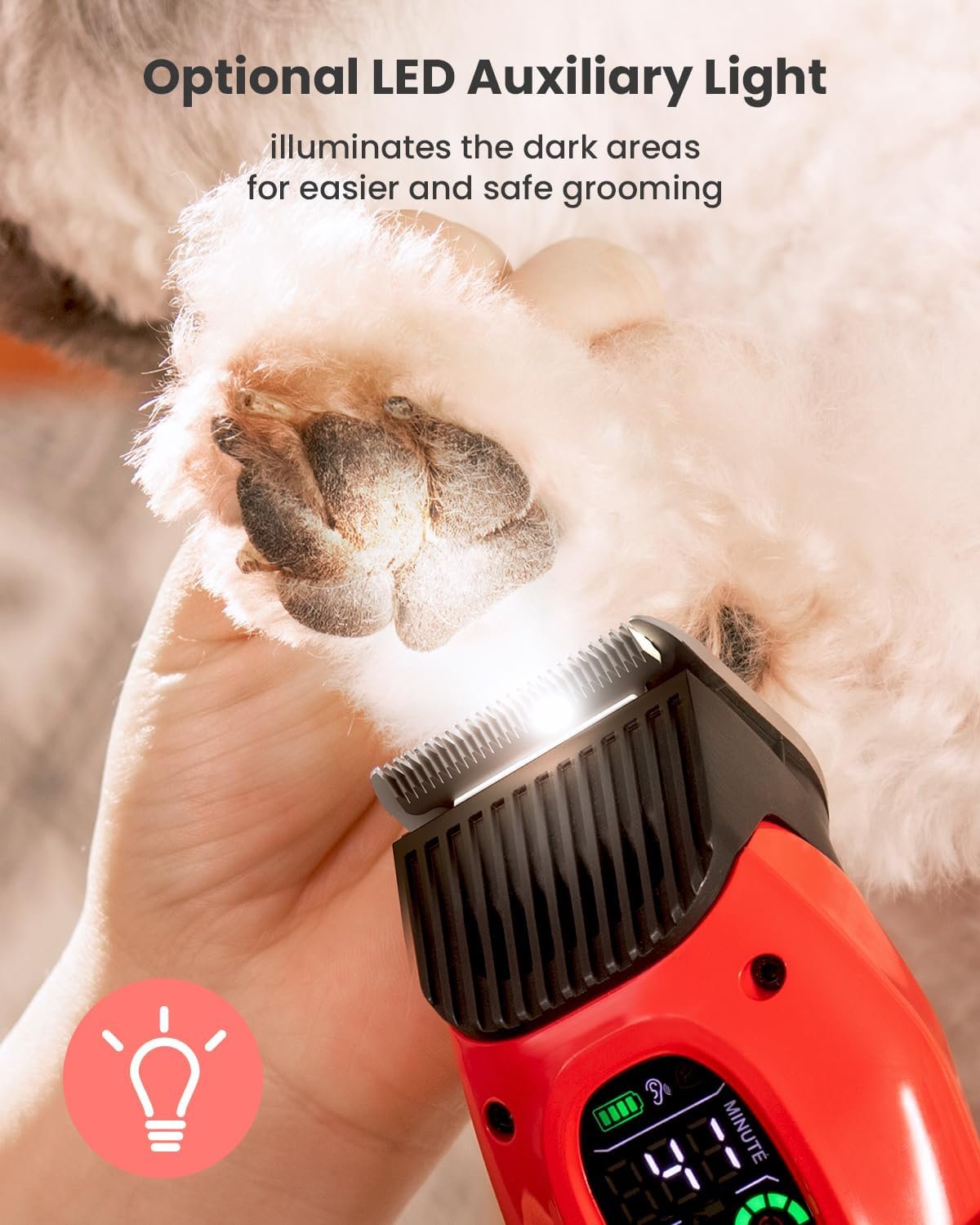 【Better Control with Auxiliary Lighting and LED Display】Auxiliary Lighting ensures you have a clear view by Illuminates tricky areas like the paws, underarms and the hygiene area. Besides, large led display will show you the real-time status of the electric clippers like clipping speed, blade service life, remaining operation time, oil blades reminder. Trimming becomes easier and safer